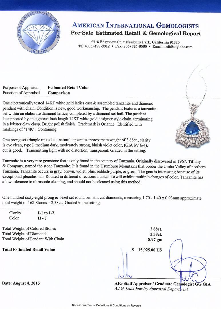 One electronically tested 14KT white gold ladies cast & assembled tanzanite and diamond pendant with chain. The pendant features a tanzanite set within an elaborate diamond lattice, completed by a diamond set bail. The pendant is supported by an eighteen inch length 14KT white gold designer style chain, terminating in a lobster claw clasp. Bright polish finish. Trademark is Orianne. Identified with markings of "14K". Condition is new, good workmanship. Containing: One prong set triangle mixed cut natural tanzanite approximate weight of 3.88ct., clarity is eye clean, type I, medium dark, moderately strong, bluish violet color, (GIA bV 6/4), cut is good. Transmitting light with no distortion, transparent. Graded in the setting.Tanzanite is a very rare gemstone that is only found in the country of Tanzania. Originally discovered in 1967. Tiffany & Company, named the stone Tanzanite. It is found in the Usumburu Mountains that border the Umba Valley of northern Tanzania. Tanzanite occurs in gray, brown, violet, blue, reddish-purple, & green. The gem is interesting because of its exceptional pleochroism. Rotated in different directions a tanzanite will exhibit multiple changes of color. Tanzanite has a low tolerance to ultrasonic cleaning, and should not be cleaned using this method.One Hundred Sixty-Eight prong & bezel set round brilliant cut diamonds, measuring 1.70 - 1.40 x 0.93mm approximate. Total Weight of 168 Stones = 2.38ct. Graded in the setting. Clarity: I-1 to I-2. Color: H - J. Total Weight of Colored Stones 3.88ct. Total Weight of Diamonds 2.38ct. Total Weight of Pendant With Chain 8.97gm. AIG Appraised at $15,925.00.