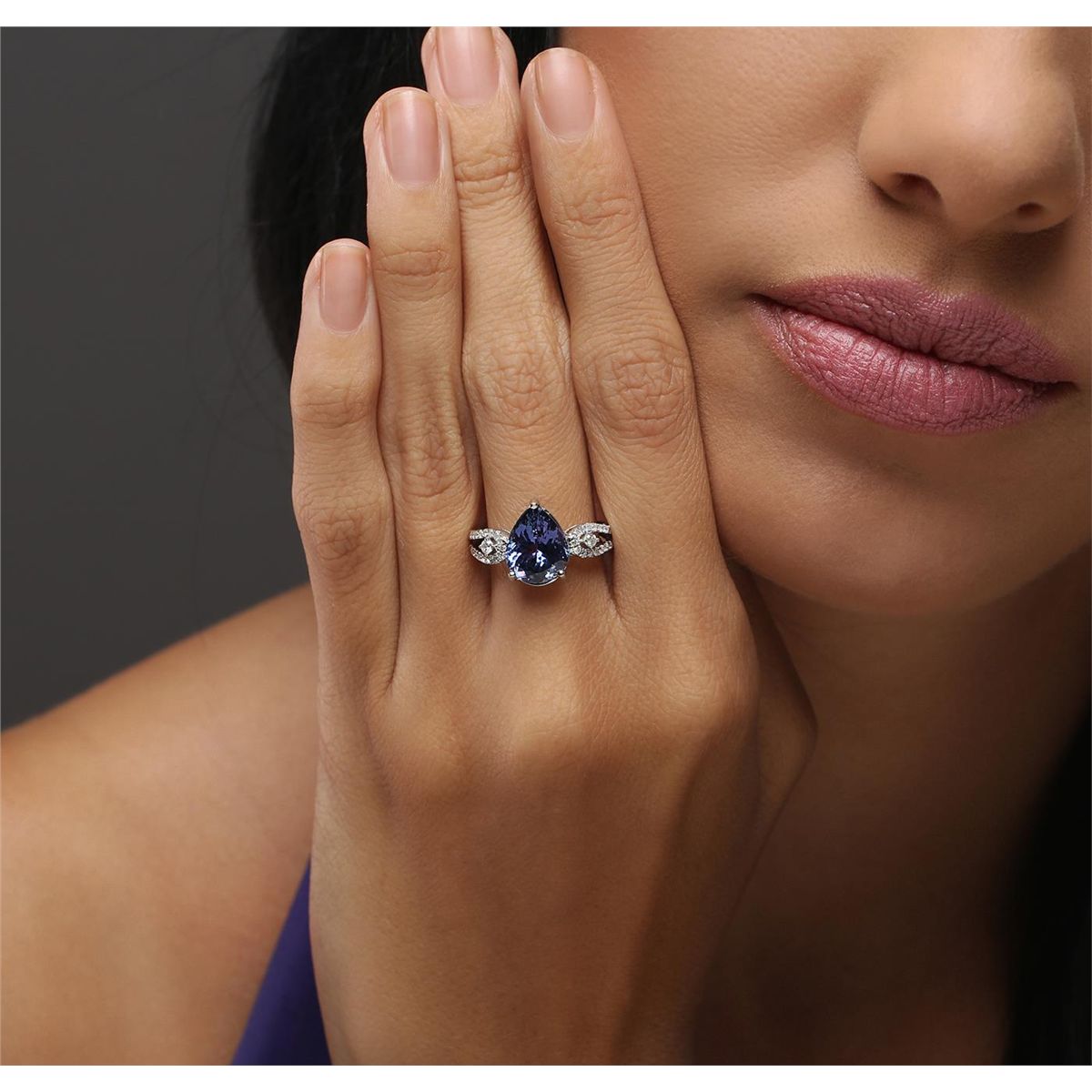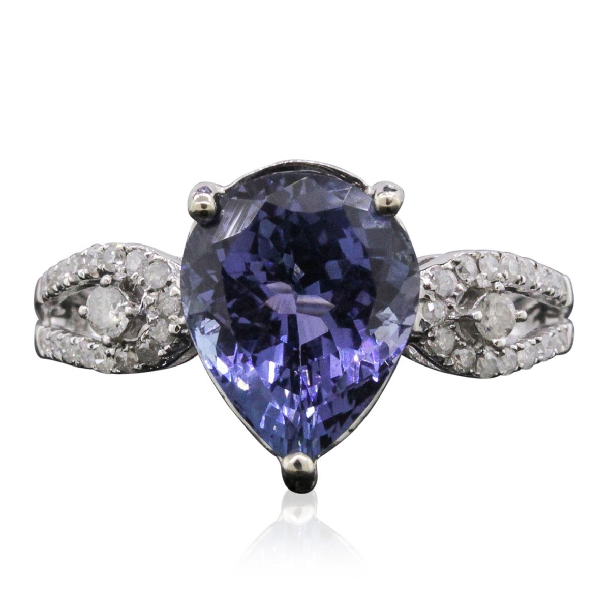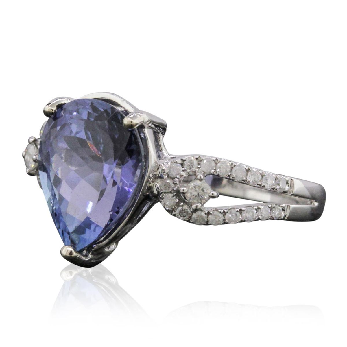 One electronically tested 14KT white gold ladies combination cast & assembled tanzanite and diamond ring with a split shank with a bright polish finish. Identified with markings of "14K". Condition is new. Containing: One prong set pear modified brilliant cut natural tanzanite, measuring 11.00 x 8.88 x 5.93mm, approximate weight of 3.88ct., clarity is eye clean, type I, medium, very slightly grayish, violet color, (GIA V 5/3), cut is good. Thirty-Six prong set round brilliant cut diamonds, measuring 1.50 - 1.20 x 0.81mm (depth est.) approximate total weight of 36 Stones = 0.20ct. Clarity: I-1 to I-2. Color: I - J, Cut is Good. Colored gemstones are presumed to have been subjected to commonly used enhancement processes. All diamonds and colored gemstones are graded in the mounting, unless otherwise stated. Total Weight of Colored Stones 3.88ct. Total Weight of Diamonds 0.20ct. Total Weight of Ring 3.30 grams. GGL Appraised at $6,895.00. GGL Appraised at $31,865.00.
