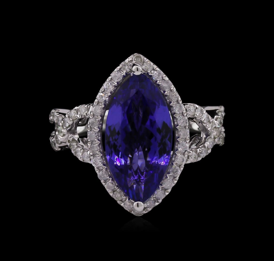 One electronically tested 14KT white gold Ladies cast ring with a bright polish finish. Condition is new. Identified with markings of "14K". Containing: One prong set marquise modified brilliant cut natural tanzanite, measuring 15.00 x 7.90 x 5.14mm, approximate weight of 3.88ct., clarity is eye clean, type I, medium, moderately strong, violet color, (GIA V 5/4), cut is good. Colored gemstones are presumed to have been subjected to commonly used color/clarity enhancement processes. Fifty-Nine prong set round brilliant cut diamonds, measuring 1.30 - 1.30 x 0.78mm (depth est.) approximate. Total Weight of 59 Stones = 0.47ct. Clarity: I-1 to I-3. Color: I - J, Cut is Good. All grading of diamonds and colored gemstones in this piece of jewelry are graded in the mounting, unless otherwise stated. Total Weight of Colored Stones 3.88ct. Total Weight of Diamonds 0.47ct. Total Weight of Ring 6.30 grams. GGL Appraised at $8,480.00.