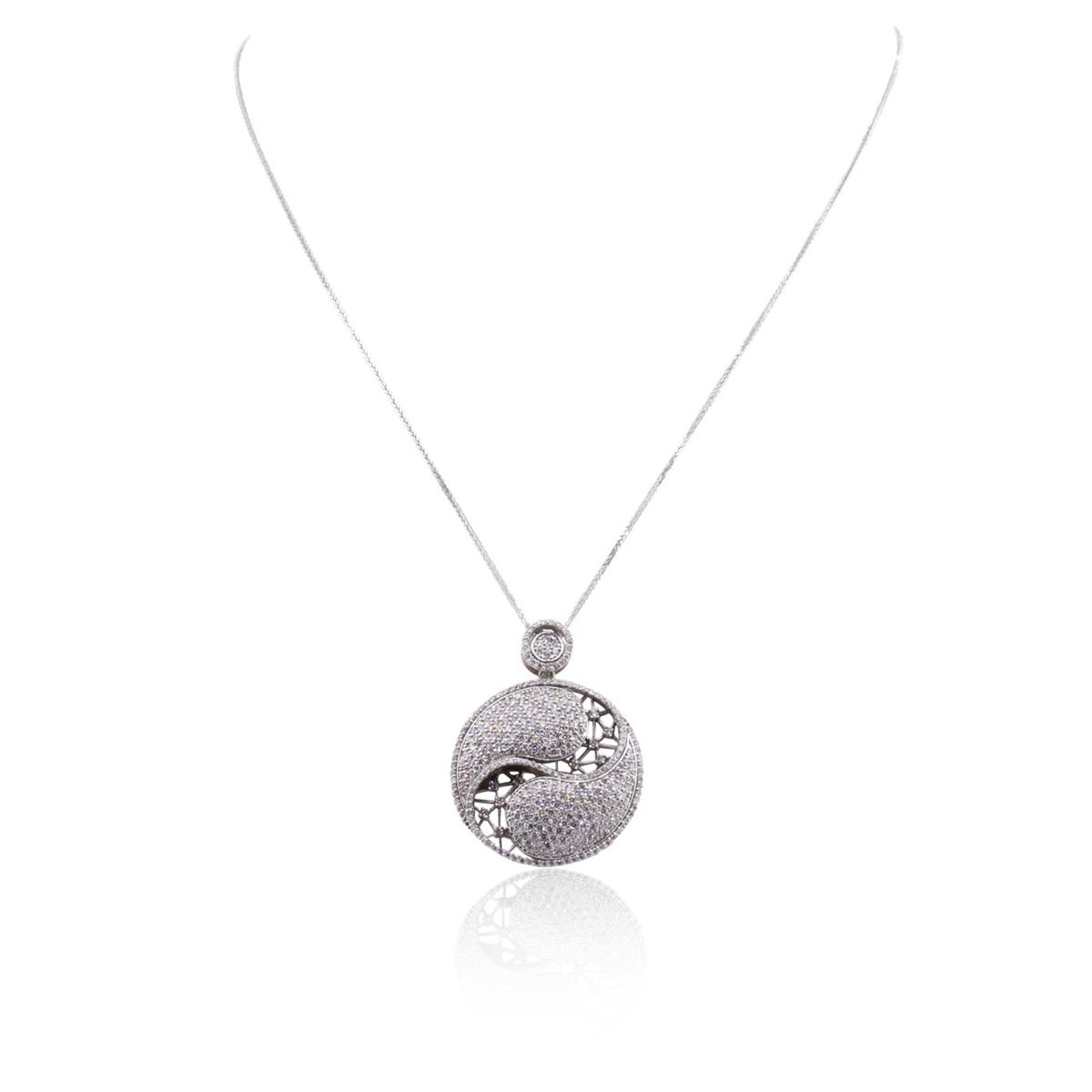 One electronically tested 14KT white gold ladies combination cast & assembled diamond pendant & chain 18.0 long, medium fancy link with a lobster claw clasp with a bright polish finish. Identified with markings of 585. Condition is new. Containing: Five Hundred Forty-Six prong set round brilliant cut diamonds, measuring 1.40 - 1.10 x 0.75mm (depth est.) approximate total weight of 546 Stones = 3.88ct. Clarity: SI-2 to I-1. Color: I - J, Cut is Good. All diamonds are graded in the mounting, unless otherwise stated. Total Weight of Diamonds 3.88ct. Total Weight of Pendant & Chain 15.00 grams. GGL Appraised at $9,440.00.