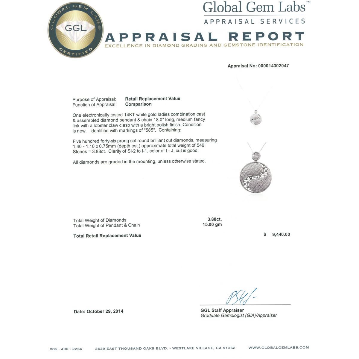 One electronically tested 14KT white gold ladies combination cast & assembled diamond pendant & chain 18.0 long, medium fancy link with a lobster claw clasp with a bright polish finish. Identified with markings of 585. Condition is new. Containing: Five Hundred Forty-Six prong set round brilliant cut diamonds, measuring 1.40 - 1.10 x 0.75mm (depth est.) approximate total weight of 546 Stones = 3.88ct. Clarity: SI-2 to I-1. Color: I - J, Cut is Good. All diamonds are graded in the mounting, unless otherwise stated. Total Weight of Diamonds 3.88ct. Total Weight of Pendant & Chain 15.00 grams. GGL Appraised at $9,440.00.