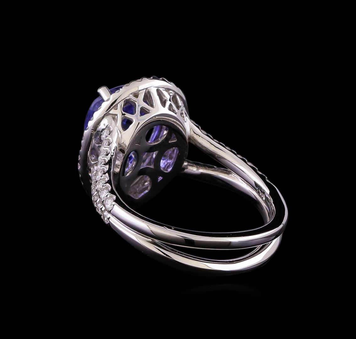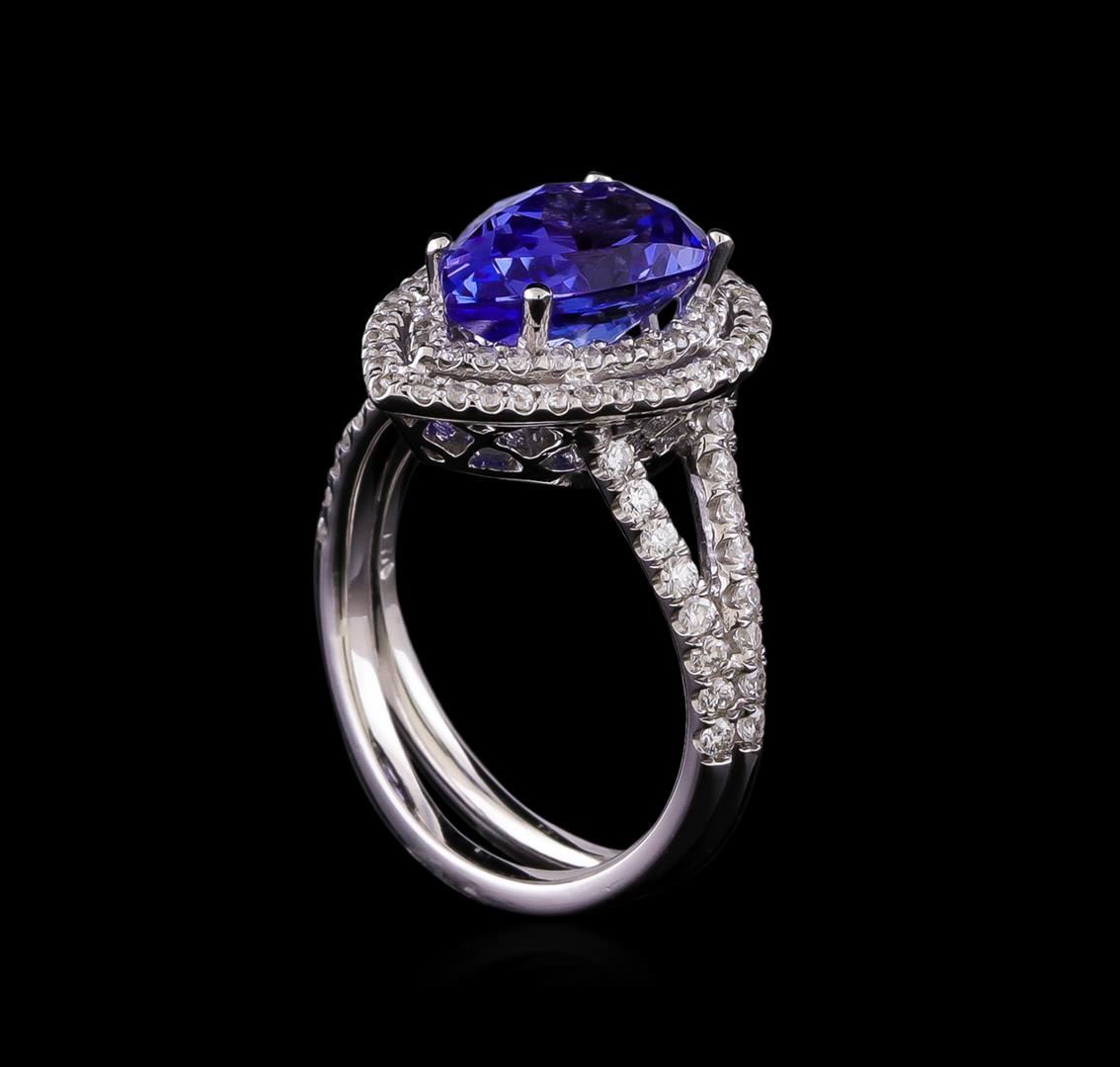 One electronically tested 14KT white gold ladies combination cast & assembled tanzanite and diamond ring with a split shank with a bright polish finish. Identified with markings of 14K. Condition is new. Containing: One prong set pear modified brilliant cut natural tanzanite, measuring 10.95 x 7.79 x 6.80mm, approximate weight of 3.89ct., clarity is eye clean, type I, medium light, very slightly grayish, violet color, (GIA V 4/3), cut is good. Ninety-Four prong set round brilliant cut diamonds, measuring 1.30 - 1.10 x 0.72mm (depth est.) approximate total weight of 94 Stones = 0.59ct. Clarity: I-1 to I-2. Color: H - I, Cut is Good. Colored gemstones are presumed to have been subjected to commonly used enhancement processes. All diamonds and colored gemstones are graded in the mounting, unless otherwise stated. Total Weight of Colored Stones 3.89ct. Total Weight of Diamonds 0.59ct. Total Weight of Ring 5.76 grams. GGL Appraised at $5,960.00.