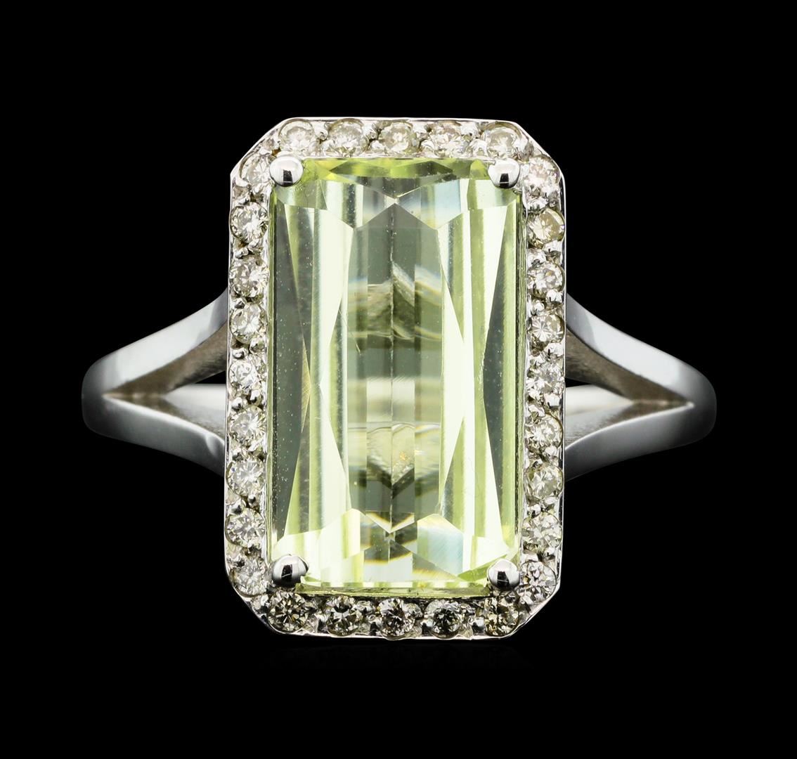 One lady's ring featuring: 14KT white gold weighing 4.6 grams containing one center green quartz weighing 3.90ct and twenty-eight diamonds weighing 0.25ctw.