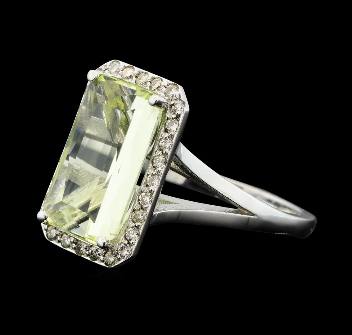 One lady's ring featuring: 14KT white gold weighing 4.6 grams containing one center green quartz weighing 3.90ct and twenty-eight diamonds weighing 0.25ctw.