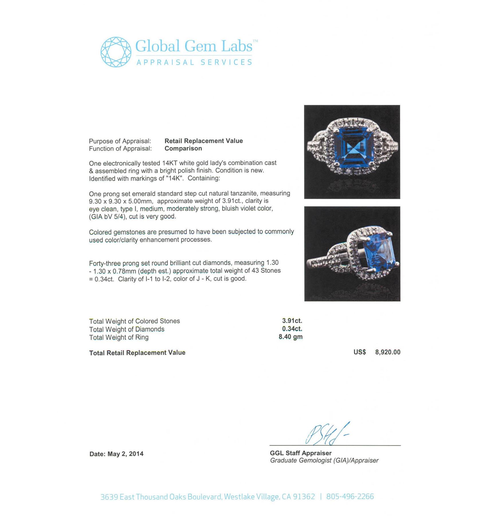 One electronically tested 14KT white gold Ladies combination cast & assembled ring with a bright polish finish. Condition is new. Identified with markings of "14K". Containing: One prong set emerald standard step cut natural tanzanite, measuring 9.30 x 9.30 x 5.00mm, approximate weight of 3.91ct., clarity is eye clean, type I, medium, moderately strong, bluish violet color, (GIA bV 5/4), cut is very good. Colored gemstones are presumed to have been subjected to commonly used color/clarity enhancement processes. Forty-Three prong set round brilliant cut diamonds, measuring 1.30 - 1.30 x 0.78mm (depth est.) approximate. Total Weight of 43 Stones = 0.34ct. Clarity: I-1 to I-2. Color: J - K, Cut is Good. Total Weight of Colored Stones 3.91ct. Total Weight of Diamonds 0.34ct. Total Weight of Ring 8.40 grams. GGL Appraised at $8,920.00.
