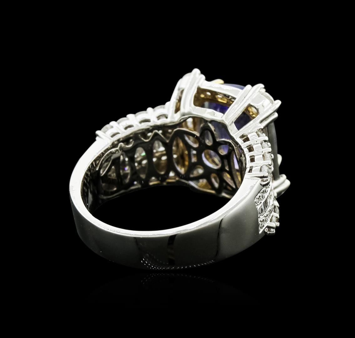 One electronically tested 14KT white gold ladies cast tanzanite and diamond ring with a bright polish finish. Identified with markings of "14K". Condition is new. Containing: One prong set rectangular cushion modified brilliant cut natural tanzanite, measuring 10.30 x 7.80 x 6.20mm, approximate weight of 3.92ct., clarity is eye clean, type I, medium light, very slightly grayish, violet color, (GIA V 4/3), cut is good. Sixty prong set round brilliant cut diamonds, measuring 2.50 - 1.20 x 1.11mm (depth est.) approximate total weight of 60 Stones = 0.50ct. Clarity: SI-1 to I-1. Color: G - H, Cut is Good. Thirty-Two prong set baguette cut diamonds, measuring from 1.30 x 1.30 x 1.11mm (depth est.) to 2.00 x 1.30 x 1.11mm (depth est.) approximate total weight of 32 Stones = 0.69ct. Clarity: SI-1. Color: I - J, Cut is Good. Colored gemstones are presumed to have been subjected to commonly used enhancement processes. All diamonds and colored gemstones are graded in the mounting, unless otherwise stated. Total Weight of Colored Stones 3.92ct. Total Weight of Diamonds 1.19ct. Total Weight of Ring 8.30 grams. GGL Appraised at $5,835.00.