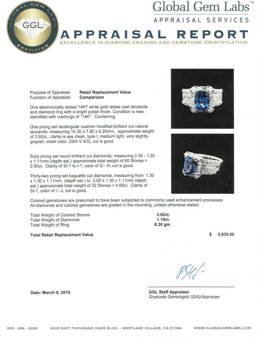 One electronically tested 14KT white gold ladies cast tanzanite and diamond ring with a bright polish finish. Identified with markings of "14K". Condition is new. Containing: One prong set rectangular cushion modified brilliant cut natural tanzanite, measuring 10.30 x 7.80 x 6.20mm, approximate weight of 3.92ct., clarity is eye clean, type I, medium light, very slightly grayish, violet color, (GIA V 4/3), cut is good. Sixty prong set round brilliant cut diamonds, measuring 2.50 - 1.20 x 1.11mm (depth est.) approximate total weight of 60 Stones = 0.50 ct. Clarity: SI-1 to I-1. Color: G - H, Cut is Good. Thirty-Two prong set baguette cut diamonds, measuring from 1.30 x 1.30 x 1.11mm (depth est.) to 2.00 x 1.30 x 1.11mm (depth est.) approximate total weight of 32 Stones = 0.69ct. Clarity: SI-1. Color: I - J, Cut is Good. Colored gemstones are presumed to have been subjected to commonly used enhancement processes. All diamonds and colored gemstones are graded in the mounting, unless otherwise stated. Total Weight of Colored Stones 3.92ct. Total Weight of Diamonds 1.19ct. Total Weight of Ring 8.30 grams. GGL Appraised.