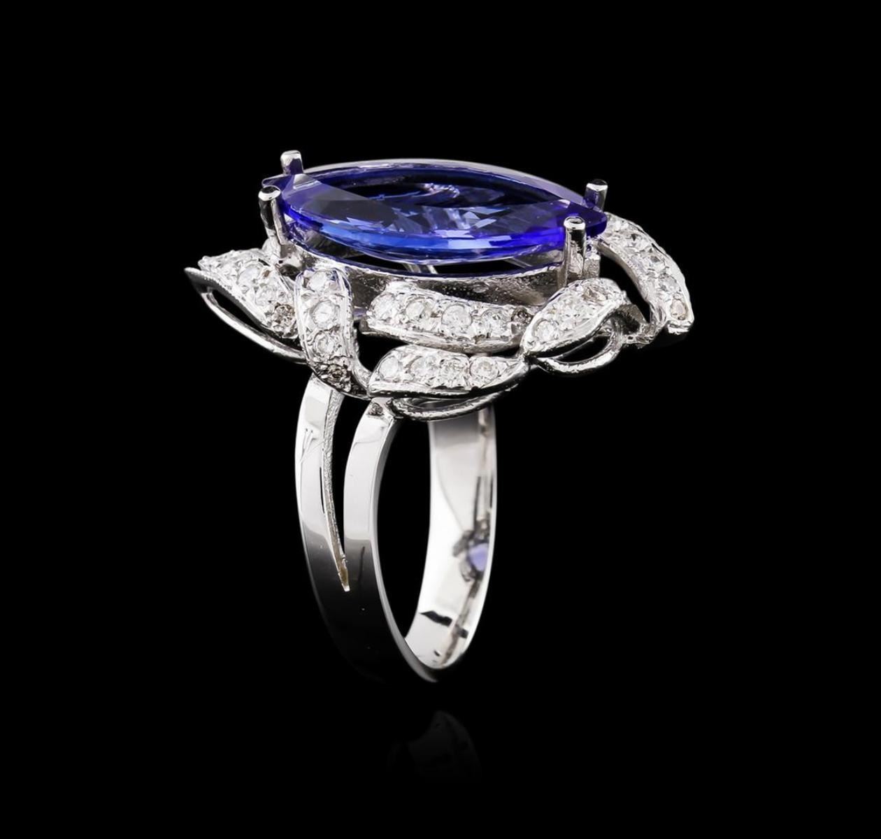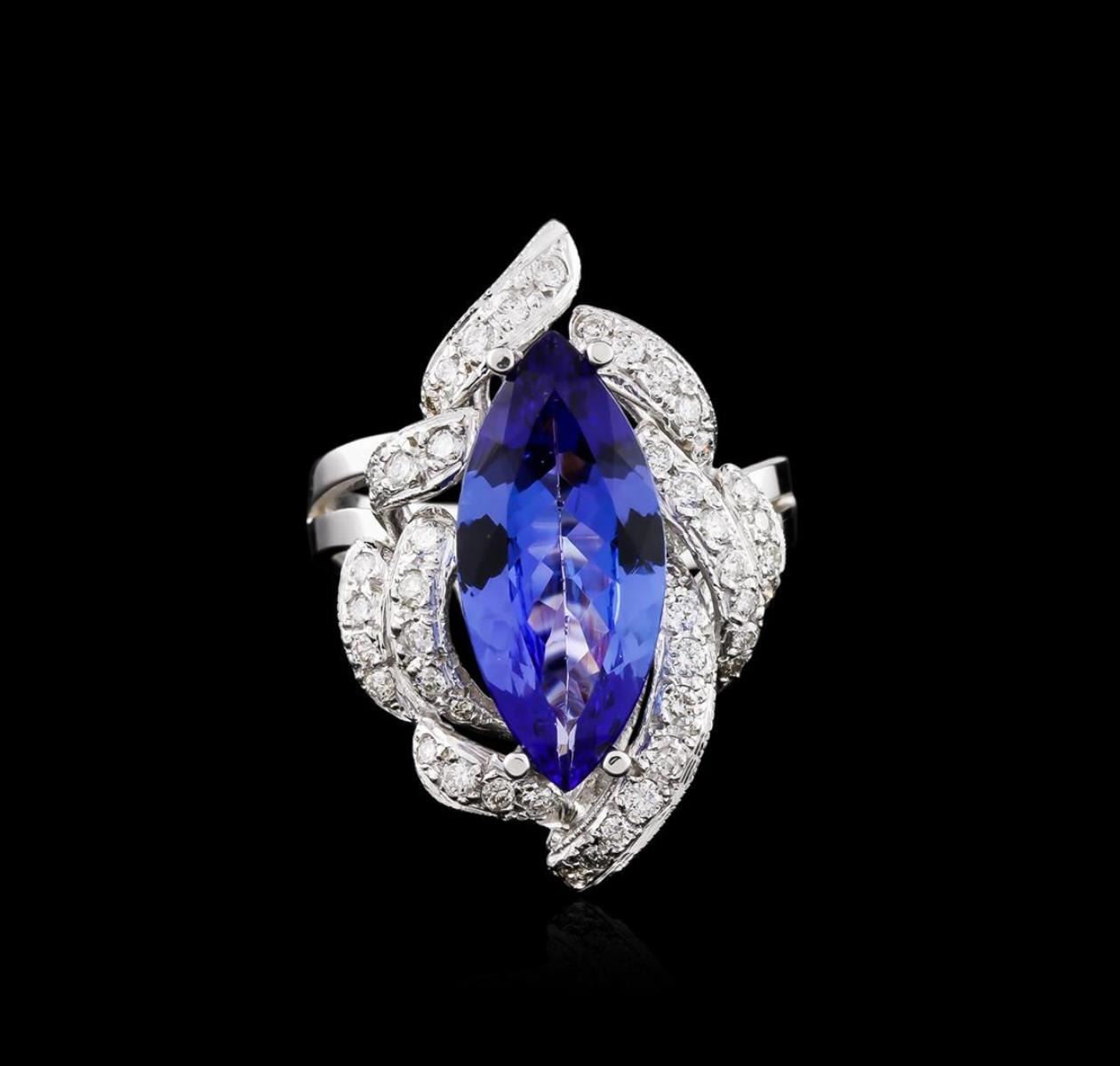 One electronically tested 14KT white gold ladies cast tanzanite and diamond ring with a split shoulder shank with a bright polish finish. Identified with markings of "K14". Condition is new. Containing: One prong set marquise modified brilliant cut natural tanzanite, measuring 16.95 x 7.90 x 4.60mm, approximate weight of 3.92ct., clarity is eye clean, type I, medium light, moderately strong, violet color, (GIA V 4/4), cut is good. Forty-Five prong set round brilliant cut diamonds, measuring 1.30 - 1.30 x 0.78mm (depth est.) approximate total weight of 45 Stones = 0.36ct. Clarity of SI-1 to I-1, Color of I - J, Cut is Good. All diamonds and colored gemstones are graded in the mounting, unless otherwise stated. Colored gemstones are presumed to have been subjected to commonly used enhancement processes. Total Weight of Colored Stones 3.92ct. Total Weight of Diamonds 0.36ct. Total Weight of Ring 7.00 grams. GGL Appraised.