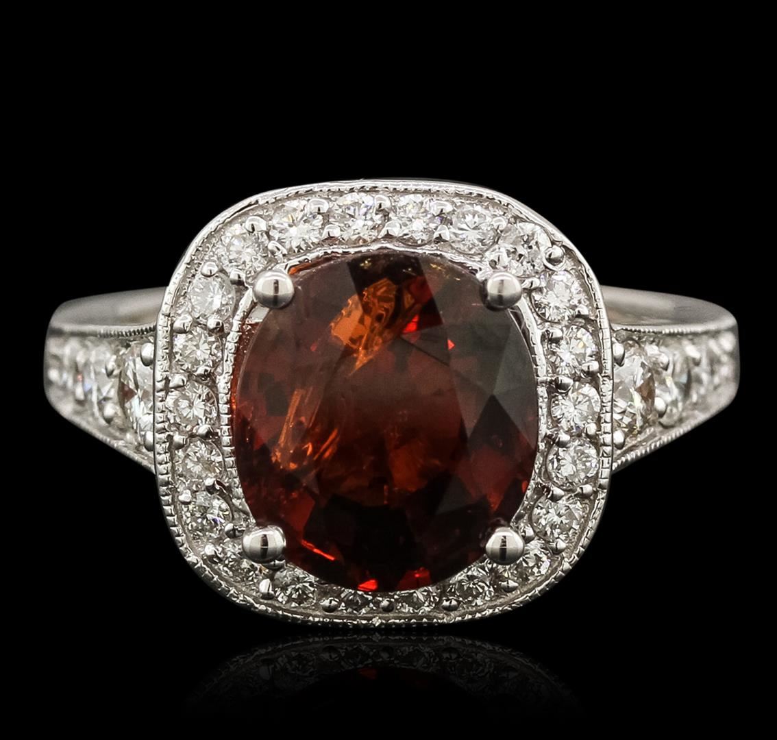 One electronically tested 14KT white gold ladies cast spessartite & diamond ring with a bright finish. Identified with markings of "14K". Condition is new, good workmanship. Containing: One prong set oval mixed cut natural malaya garnet, measuring 10.00 x 8.60 x 5.65mm, 5%. bulge factor, approximate weight of 3.92ct., clarity is heavily included, type II, dark, very slightly brownish, reddish orange color, (GIA rO 7/3), cut is good. Transmitting light somewhat diffusely, transparent to translucent. Naturally occurring internal & external characteristics are present. Graded in the setting. Forty-Two prong set round brilliant cut diamonds, measuring 3.00 - 1.50 x 1.35mm (depth est.) approximate. Total Weight of 42 Stones = 0.68ct. Graded in the setting. Clarity: VS-2 to SI-2. Color: G - I. Total Weight of Colored Stones 3.92ct. Total Weight of Diamonds 0.68ct. Total Weight of Ring 6.01gm. AIG Appraised at $4,700.00.