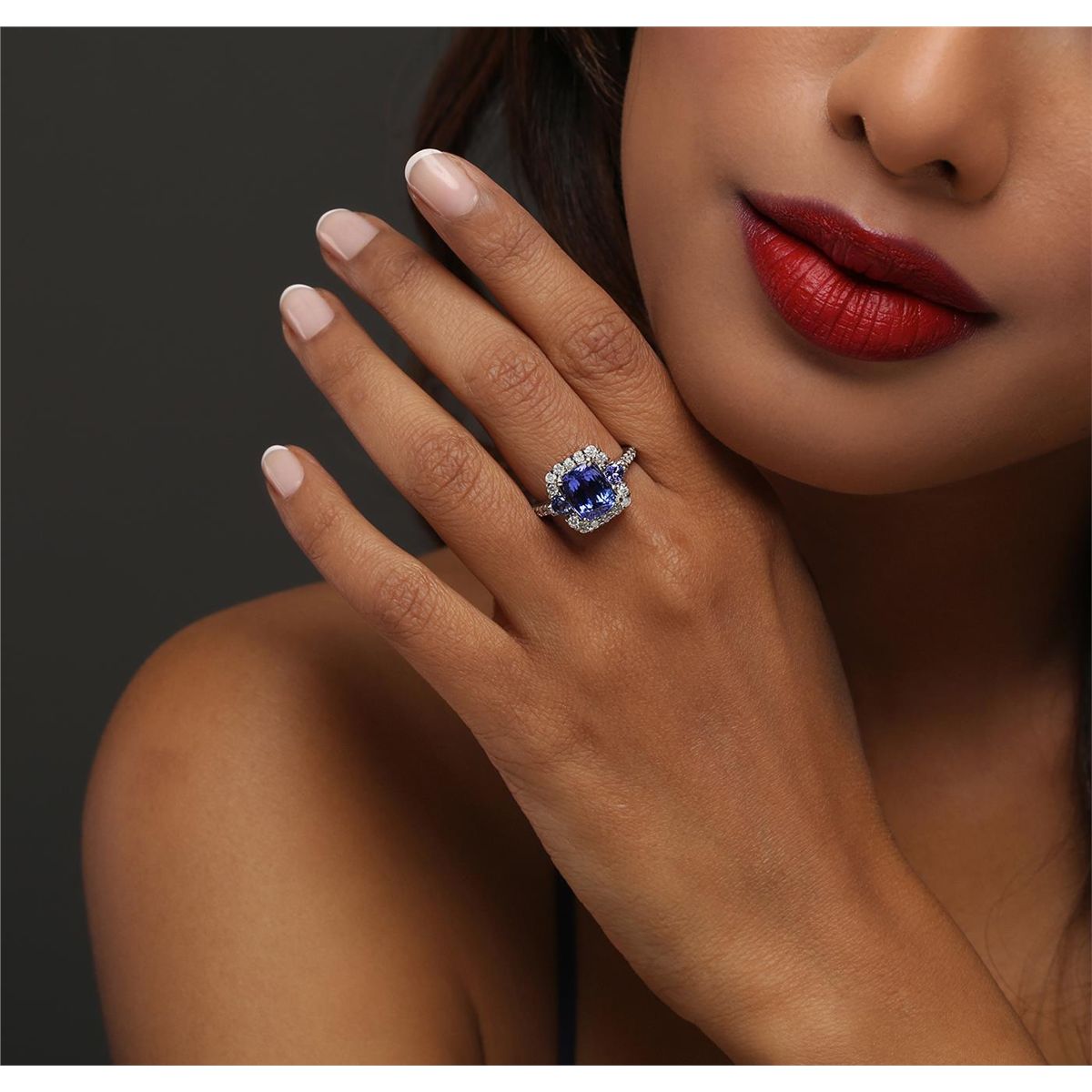 One electronically tested 14KT white gold ladies combination cast & assembled tanzanite and diamond ring with a flat shank with a bright polish finish. Identified with markings of "14K". Condition is new. Containing: One prong set rectangular cushion modified brilliant cut natural tanzanite, measuring 9.58 x 7.50 x 6.05mm, approximate weight of 3.42ct., clarity is eye clean, type I, medium, moderately strong, bluish violet color, (GIA bV 5/4), cut is good. Two prong set round modified brilliant cut natural tanzanites, measuring 3.90 - 3.90 x 2.54 mm, approximate total weight of 0.52ct., clarity is eye clean, type I, medium, moderately strong, bluish violet color, (GIA bV 5/4), cut is very good. Twenty-Six prong set round brilliant cut diamonds, measuring 1.80 - 1.50 x 0.99mm (depth est.) approximate total weight of 26 Stones = 0.43ct. Clarity: I-1 to I-2. Color: I - J, Cut is Good. Colored gemstones are presumed to have been subjected to commonly used enhancement processes. All diamonds and colored gemstones are graded in the mounting, unless otherwise stated. Total Weight of Colored Stones 3.94ct. Total Weight of Diamonds 0.43ct. Total Weight of Ring 5.10 grams. GGL Appraised at $9,055.00.