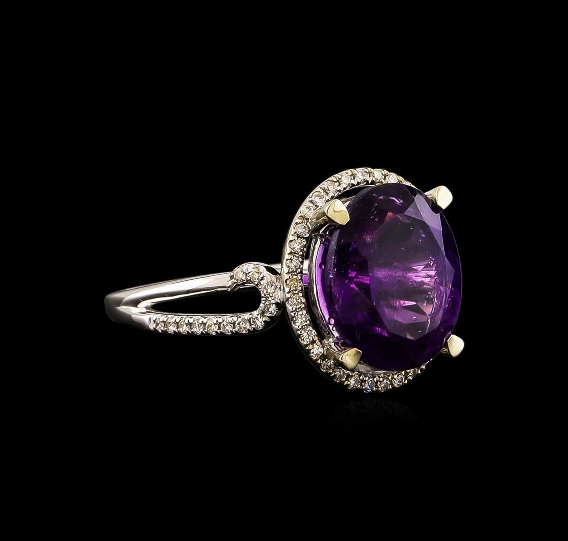 One electronically tested 14KT white gold ladies combination cast & assembled ring with a bright polish finish. Condition is new. Identified with markings of "14K". Containing: One prong set oval modified brilliant cut natural amethyst, measuring 11.80 x 9.80 x 6.37mm, approximate weight of 3.95ct., clarity is eye clean, type II, medium light, very slightly grayish, purple color, (GIA P 4/3), cut is very good. Fifty-Eight prong set round brilliant cut diamonds, measuring 1.00 - 1.00 x 0.60mm (depth est.) approximate total weight of 58 Stones = 0.21ct. Clarity: I-1 to I-2. Color: H - I, Cut is Good. Colored gemstones are presumed to have been subjected to commonly used enhancement processes. All diamonds and colored gemstones are graded in the mounting, unless otherwise stated. Total Weight of Colored Stones 3.95ct. Total Weight of Diamonds 0.21ct. Total Weight of Ring 4.20 grams. GGL Appraised.