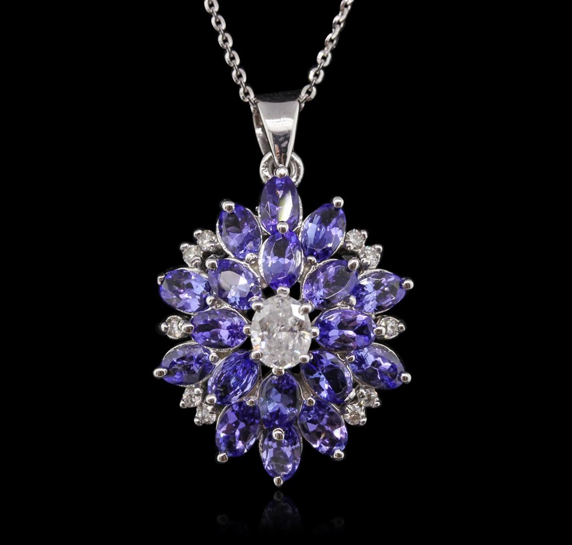 One electronically tested 14KT white gold ladies cast & assembled tanzanite and diamond pendant with chain. Condition is new, good workmanship. The pendant features a tanzanite and diamond floret completed by a white gold bail. The pendant is supported by an eighteen inch length 14KT white gold designer style chain terminating in a spring ring clasp. Bright polish finish. Identified with markings of "14K". Containing: One prong set oval shaped cut diamond, measuring 5.60 x 4.60 x 2.90mm (depth est.) approximate weight of 0.51ct with a strong blue fluorescence. Graded in the setting. Clarity: I-1. Color: Depth 63.0%. Table 60.9%. Eighteen prong set oval mixed cut natural tanzanites, measuring 5.00 x 3.00 x 1.95mm, approximate total weight of 3.96ct., clarity is eye clean, type I, medium dark, moderately strong, bluish violet color, (GIA bV 6/4), cut is good. Transmitting light with no distortion, transparent. Graded in the setting. Tanzanite is a very rare gemstone that is only found in the country of Tanzania. Originally discovered in 1967. Tiffany & Company, named the stone Tanzanite. It is found in the Usumburu Mountains that border the Umba Valley of northern Tanzania. Tanzanite occurs in gray, brown, violet, blue, reddish-purple, & green. The gem is interesting because of its exceptional pleochroism. Rotated in different directions a tanzanite will exhibit multiple changes of color. Tanzanite has a low tolerance to ultrasonic cleaning, and should not be cleaned using this method. Ten prong set round brilliant cut diamonds, measuring 1.50 - 1.50 x 0.90mm (depth est.) approximate total weight of 10 Stones = 0.18ct. Graded in the setting. Clarity: SI-2 to I-1. Color: F - H. Total Weight of Colored Stones 3.96ct. Total Weight of Diamonds 0.69ct. Total Weight of Pendant With Chain 8.10 grams. AIG Appraised at $8,030.00.
