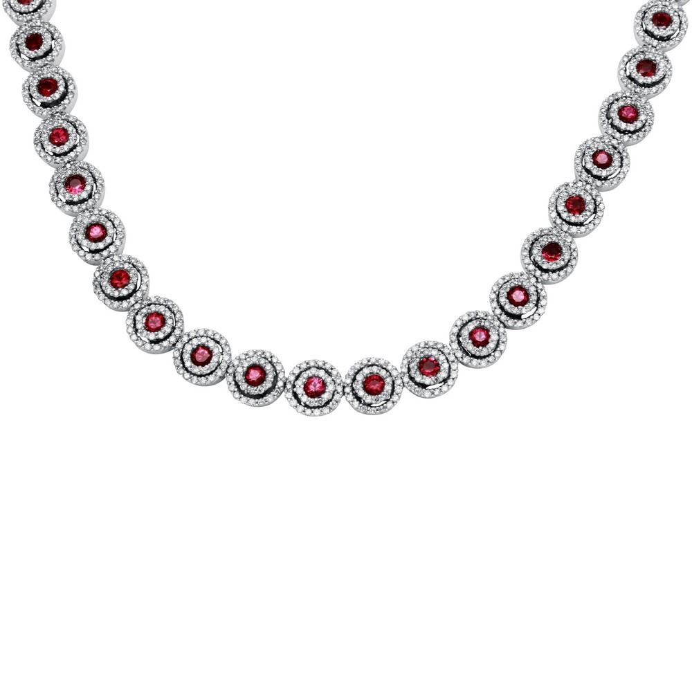 One 14KT White Gold 3.97ctw Ruby and Diamond Necklace. (30) Rubies with a total weight of 3.97cts. (870) Diamonds with a total weight of 3.74cts with a color of I and clarity of I-1. Total weight of this necklace is 43.67 grams.