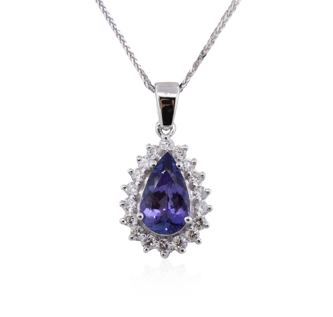 One electronically tested 14KT white gold ladies combination cast & assembled tanzanite and diamond pendant & chain 18.0" long, medium cable link with a lobster claw clasp with a bright polish finish. Identified with markings of "14K". Condition is new. Containing: One prong set pear modified brilliant cut natural tanzanite, measuring 13.58 x 8.20 x 5.33mm, approximate weight of 3.98ct., clarity is eye clean, type I, medium light, very slightly grayish, violet color, (GIA V 4/3), cut is good. Eighteen prong set round brilliant cut diamonds, measuring 2.20 - 2.20 x 1.32mm (depth est.) approximate total weight of 18 Stones = 0.70ct. Clarity: SI-1 to SI-2. Color: I - J, Cut is Good. Colored gemstones are presumed to have been subjected to commonly used enhancement processes. All diamonds and colored gemstones are graded in the mounting, unless otherwise stated. Total Weight of Colored Stones 3.98ct. Total Weight of Diamonds 0.70ct. Total Weight of Pendant & Chain 7.60 grams. GGL Appraised at $6,355.00.
