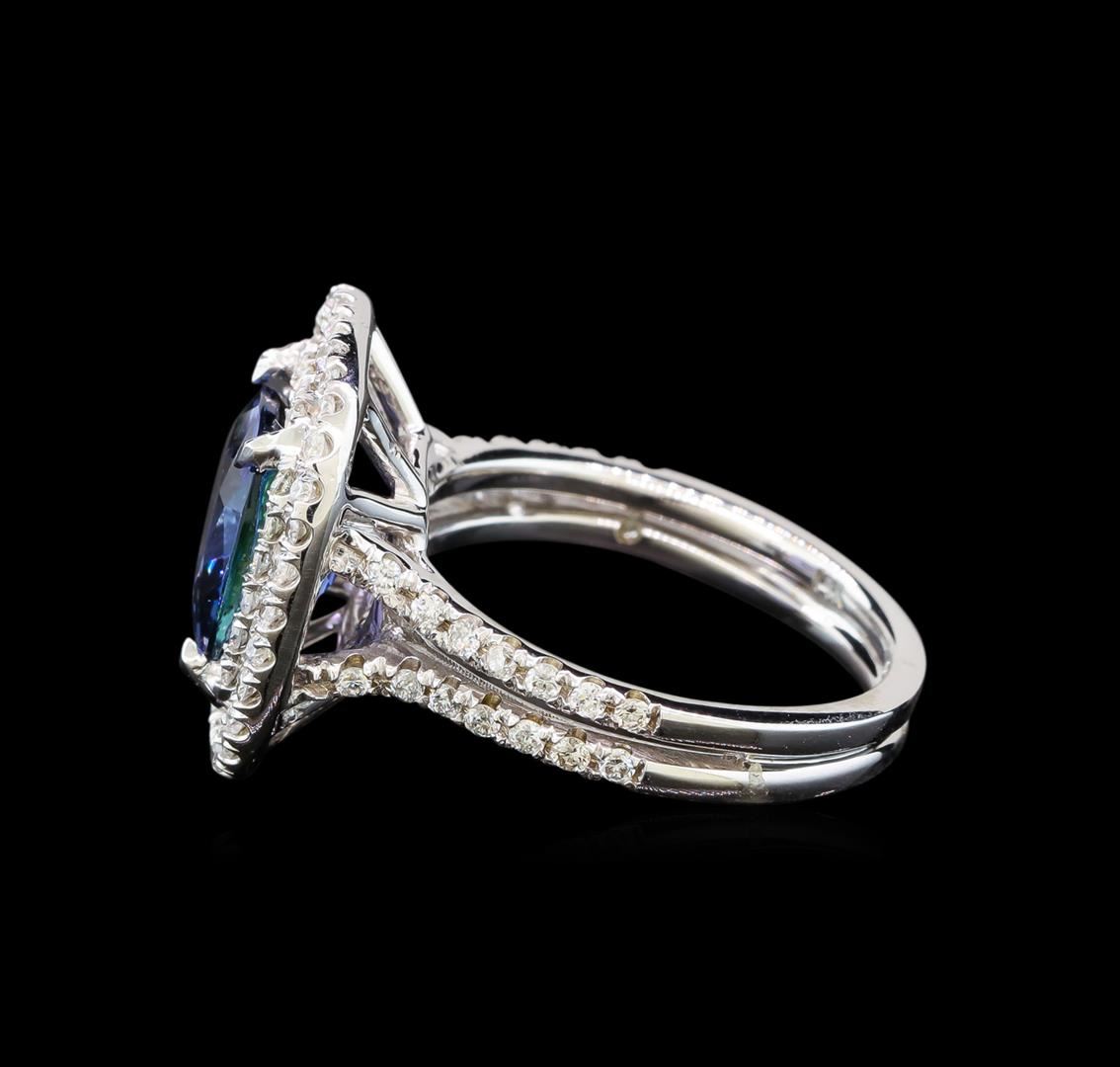 One electronically tested 14KT white gold ladies cast tanzanite and diamond ring with a bright polish finish. Identified with markings of "K14". Condition is new. Containing: One prong set square cushion modified brilliant cut natural tanzanite, measuring 9.20 x 9.20 x 5.98mm, approximate weight of 3.98ct., clarity is eye clean, type I, medium, moderately strong, violet color, (GIA V 5/4), cut is good. Eighty-Eight prong set round brilliant cut diamonds, measuring 1.30 - 1.30 x 0.78mm (depth est.) approximate total weight of 88 Stones = 0.70ct. Clarity: SI-1 to SI-2. Color: H - I, Cut is Good. Colored gemstones are presumed to have been subjected to commonly used enhancement processes. All diamonds and colored gemstones are graded in the mounting, unless otherwise stated. Total Weight of Colored Stones 3.98ct. Total Weight of Diamonds 0.70ct. Total Weight of Ring 6.20 grams. GGL Appraised at $5,580.00.