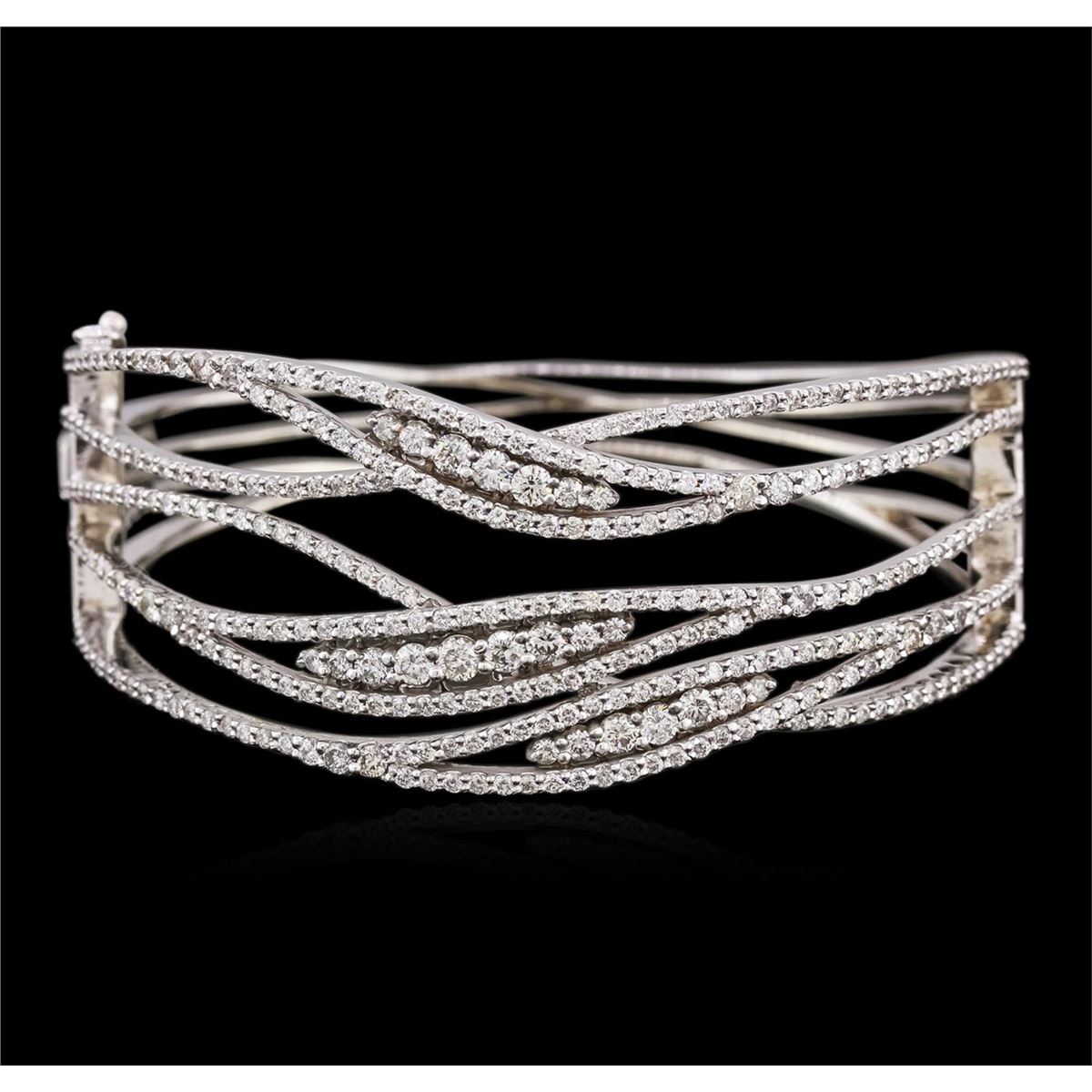 One electronically tested 14KT white gold ladies cast diamond bangle bracelet with a hidden box clasp with a bright polish finish. Condition is new. Containing: Three Hundred Forty-Seven prong set round brilliant cut diamonds, measuring 2.50 - 1.30 x 1.14mm (depth est.) approximate total weight of 347 Stones = 3.99ct. Clarity: SI-1 to I-1. Color: H - I, Cut is Good. All diamonds are graded in the mounting, unless otherwise stated. Total Weight of Diamonds 3.99ct. Total Weight of Bangle Bracelet 35.50 grams. GGL Appraised at $14,325.00.