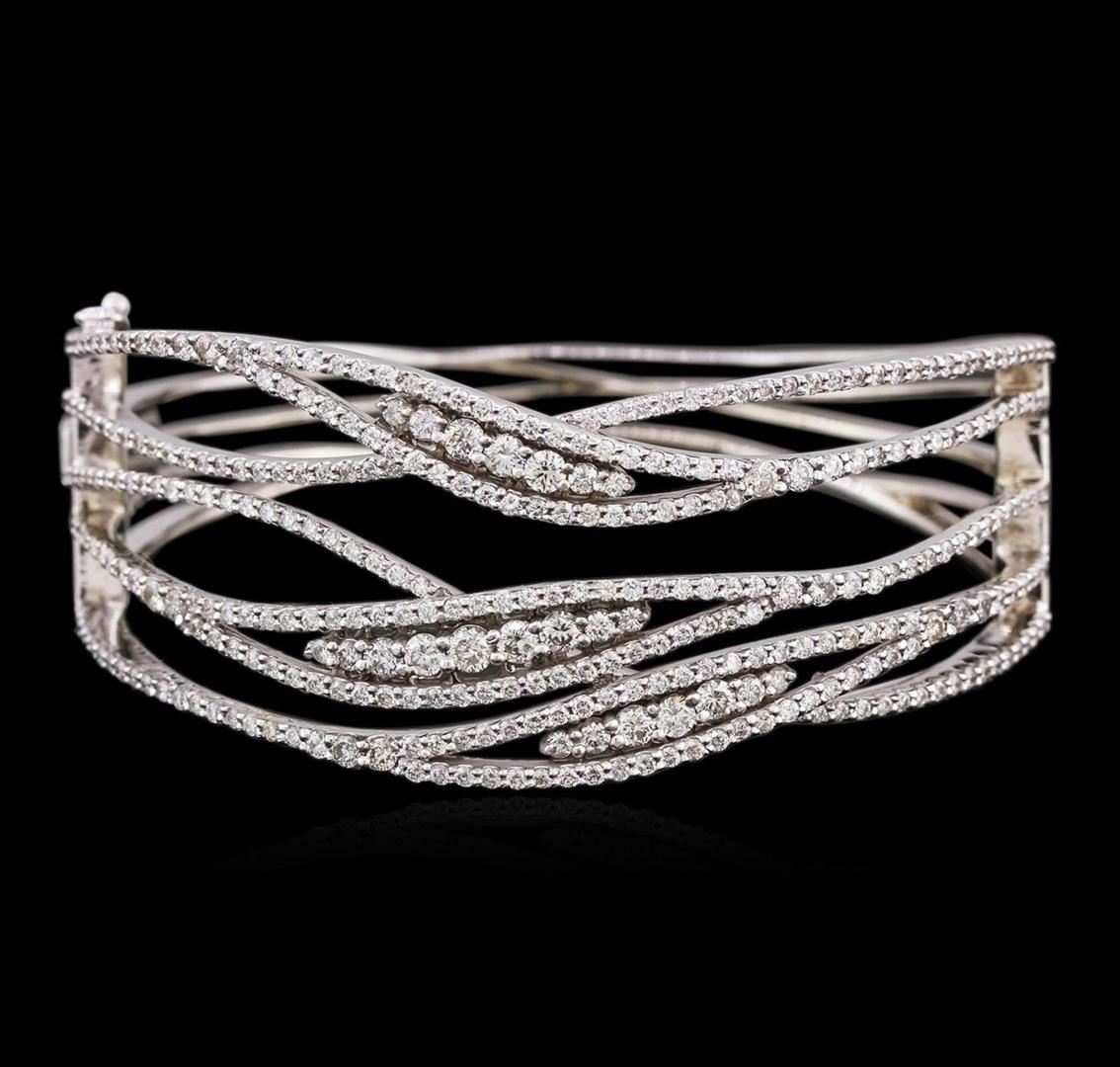 One electronically tested 14KT white gold ladies cast diamond bangle bracelet with a hidden box clasp with a bright polish finish. Condition is new. Containing: Three Hundred Forty-Seven prong set round brilliant cut diamonds, measuring 2.50 - 1.30 x 1.14mm (depth est.) approximate total weight of 347 Stones = 3.99ct. Clarity: SI-1 to I-1. Color: H - I, Cut is Good. All diamonds are graded in the mounting, unless otherwise stated. Total Weight of Diamonds 3.99ct. Total Weight of Bangle Bracelet 35.50 grams. GGL Appraised.