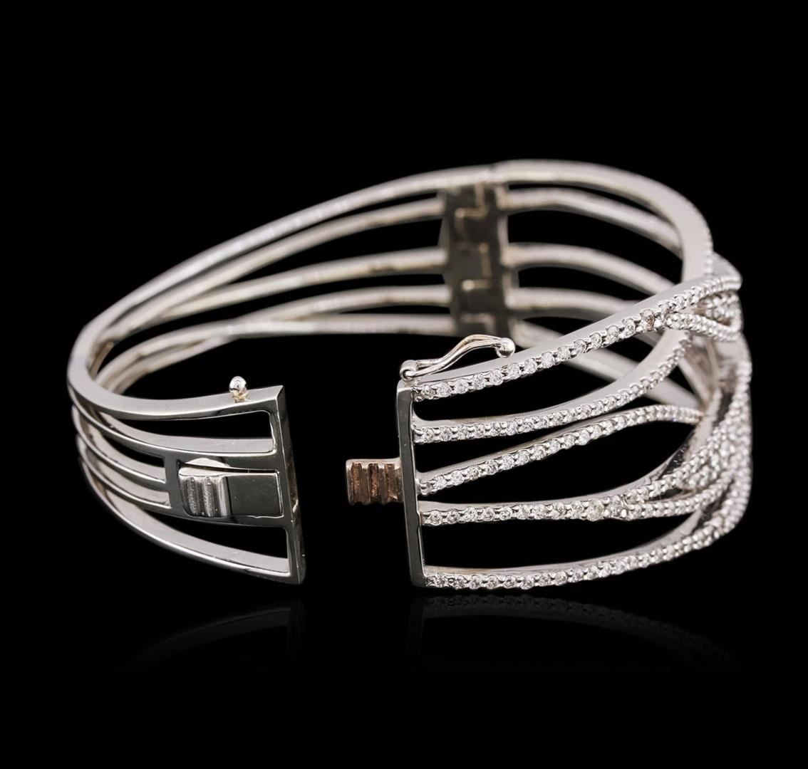 One electronically tested 14KT white gold ladies cast diamond bangle bracelet with a hidden box clasp with a bright polish finish. Condition is new. Containing: Three Hundred Forty-Seven prong set round brilliant cut diamonds, measuring 2.50 - 1.30 x 1.14mm (depth est.) approximate total weight of 347 Stones = 3.99ct. Clarity: SI-1 to I-1. Color: H - I, Cut is Good. All diamonds are graded in the mounting, unless otherwise stated. Total Weight of Diamonds 3.99ct. Total Weight of Bangle Bracelet 35.50 grams. GGL Appraised.