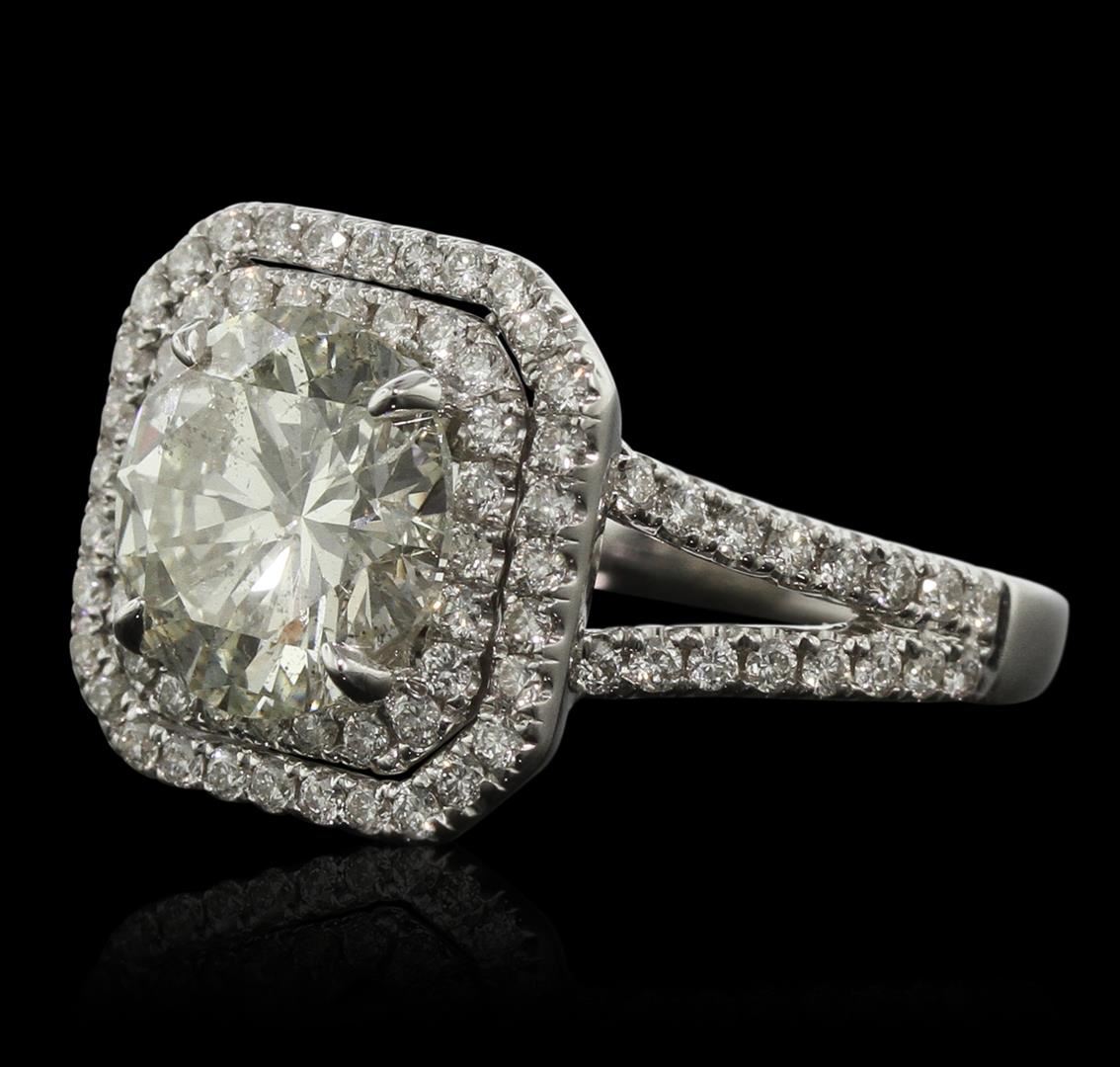 One electronically tested 14KT white gold ladies cast diamond unity ring with a bright polish finish. Condition is new, good workmanship. The featured diamond is set within a two tiered diamond bezel supported by diamond set split shoulders, completed by a two and one-half millimeter wide band. Trademark is DAYANii. Identified with markings of "14K". Containing: One prong set round brilliant cut diamond, measuring 9.30 - 9.25 x 5.70mm (depth est.) approximate weight of 3.09ct with a medium blue fluorescence. Faint secondary color throughout. Diamond Grading Report attached. Graded in the setting. Clarity: I-1. Depth: 61.4%. Table 64.7%. Eighty-Eight prong set round brilliant cut diamonds, measuring 1.40 - 1.30 x 0.81mm (depth est.) approximate. Total Weight of 88 Stones = 0.90ct. Graded in the setting. Clarity: VS-1 to SI-1. Color: G - I. Total Weight of Diamonds 3.99ct. Total Weight of Ring 5.85 grams. AIG Appraised at $33,230.00.