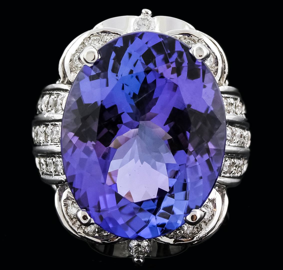 One electronically tested 14KT white gold ladies cast tanzanite and diamond ring with a bright polish finish. Identified with markings of "K14". Condition is new. Containing: One prong set oval modified brilliant cut natural tanzanite, measuring 21.70 x 17.43 x 11.33mm, approximate weight of 30.15ct., clarity is eye clean, type I, medium light, very slightly grayish, violet color, (GIA V 4/3), cut is good. Thirty prong set round brilliant cut diamonds, measuring 1.30 - 1.30 x 0.78mm (depth est.) approximate. total weight of 30 Stones = 0.24ct. Clarity: SI-1 to I-1. Color: I - J, Cut is Good. Colored gemstones are presumed to have been subjected to commonly used enhancement processes. All diamonds and colored gemstones are graded in the mounting, unless otherwise stated. Total Weight of Colored Stones 30.15ct. Total Weight of Diamonds 0.24ct. Total Weight of Ring 18.90 grams. GGL Appraised at $16,745.00.