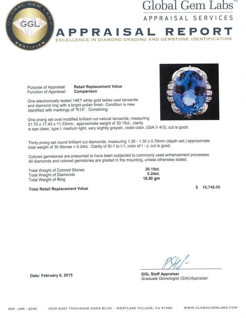 One electronically tested 14KT white gold ladies cast tanzanite and diamond ring with a bright polish finish. Identified with markings of "K14". Condition is new. Containing: One prong set oval modified brilliant cut natural tanzanite, measuring 21.70 x 17.43 x 11.33mm, approximate weight of 30.15ct., clarity is eye clean, type I, medium light, very slightly grayish, violet color, (GIA V 4/3), cut is good. Thirty prong set round brilliant cut diamonds, measuring 1.30 - 1.30 x 0.78mm (depth est.) approximate. total weight of 30 Stones = 0.24ct. Clarity: SI-1 to I-1. Color: I - J, Cut is Good. Colored gemstones are presumed to have been subjected to commonly used enhancement processes. All diamonds and colored gemstones are graded in the mounting, unless otherwise stated. Total Weight of Colored Stones 30.15ct. Total Weight of Diamonds 0.24ct. Total Weight of Ring 18.90 grams. GGL Appraised at $16,745.00.