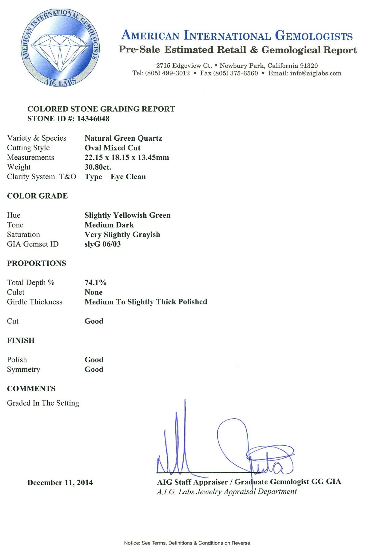 One electronically tested 14KT white gold ladies cast green quartz and diamond ring with a bright polish finish. The featured green quartz is set within a diamond bezel supported by an open heart lattice under gallery, completed by a two and one-half millimeter wide band. Identified with markings of "14K". Condition is new, good workmanship. Containing: One prong set oval mixed cut natural green quartz, measuring 22.15 x 18.15 x 13.45mm, 6% bulge factor, approximate weight of 30.80ct., clarity is eye clean, medium dark, very slightly grayish, slightly yellowish green color, (GIA slyG 6/3), cut is good. Transmitting light with no distortion, transparent. Colored Stone Grading Report attached. Graded in the setting. Twenty-Eight prong set round brilliant cut diamonds, measuring 2.50 - 2.40 x 1.47mm (depth est.) approximate total weight of 28 Stones = 1.60ct. Graded in the setting. Clarity: VS-2 to SI-2. Color: F - H. Total Weight of Colored Stones 30.80ct. Total Weight of Diamonds 1.60ct. Total Weight of Ring 15.16 grams. AIG Appraised at $8,420.00.