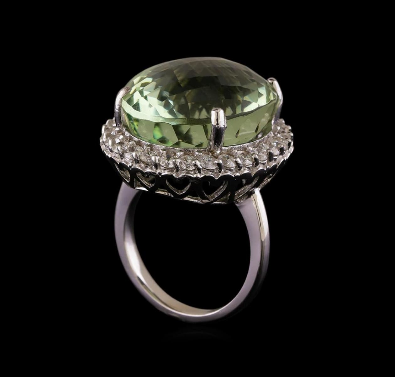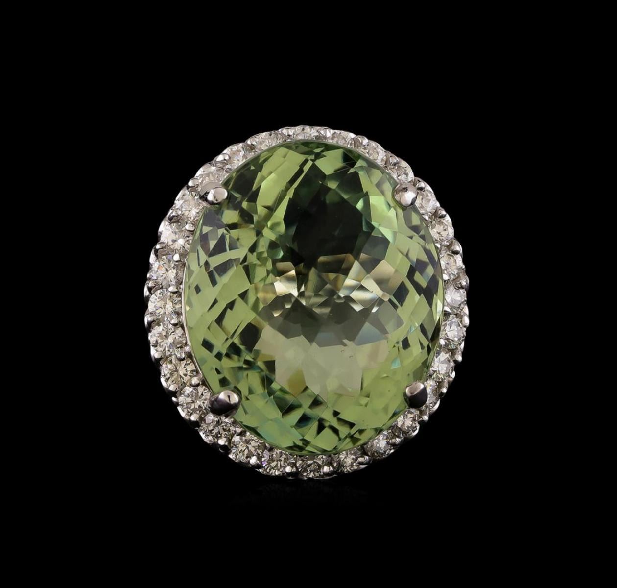 One electronically tested 14KT white gold ladies cast green quartz and diamond ring with a bright polish finish. The featured green quartz is set within a diamond bezel supported by an open heart lattice under gallery, completed by a two and one-half millimeter wide band. Identified with markings of "14K". Condition is new, good workmanship. Containing: One prong set oval mixed cut natural green quartz, measuring 22.15 x 18.15 x 13.45mm, 6% bulge factor, approximate weight of 30.80 ct., clarity is eye clean, medium dark, very slightly grayish, slightly yellowish green color, (GIA slyG 6/3), cut is good. Transmitting light with no distortion, transparent. Colored Stone Grading Report attached. Graded in the setting. Twenty-Eight prong set round brilliant cut diamonds, measuring 2.50 - 2.40 x 1.47mm (depth est.) approximate total weight of 28 Stones = 1.60 ct. Graded in the setting. Clarity: VS-2 to SI-2. Color: F - H. Total Weight of Colored Stones 30.80 ct. Total Weight of Diamonds 1.60 ct. Total Weight of Ring 15.16 grams. AIG Appraised.