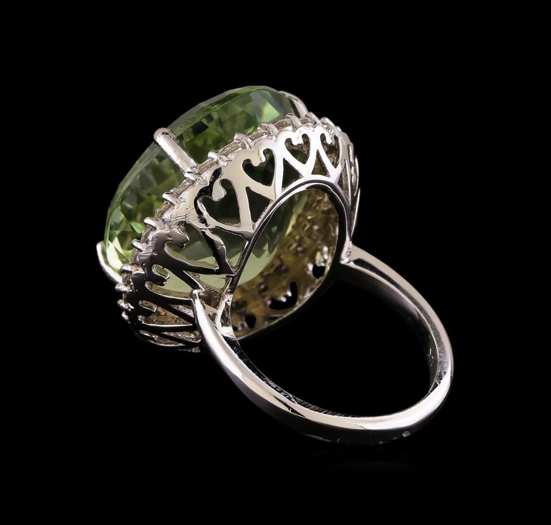 One electronically tested 14KT white gold ladies cast green quartz and diamond ring with a bright polish finish. The featured green quartz is set within a diamond bezel supported by an open heart lattice under gallery, completed by a two and one-half millimeter wide band. Identified with markings of "14K". Condition is new, good workmanship. Containing: One prong set oval mixed cut natural green quartz, measuring 22.15 x 18.15 x 13.45mm, 6% bulge factor, approximate weight of 30.80 ct., clarity is eye clean, medium dark, very slightly grayish, slightly yellowish green color, (GIA slyG 6/3), cut is good. Transmitting light with no distortion, transparent. Colored Stone Grading Report attached. Graded in the setting. Twenty-Eight prong set round brilliant cut diamonds, measuring 2.50 - 2.40 x 1.47mm (depth est.) approximate total weight of 28 Stones = 1.60 ct. Graded in the setting. Clarity: VS-2 to SI-2. Color: F - H. Total Weight of Colored Stones 30.80 ct. Total Weight of Diamonds 1.60 ct. Total Weight of Ring 15.16 grams. AIG Appraised.