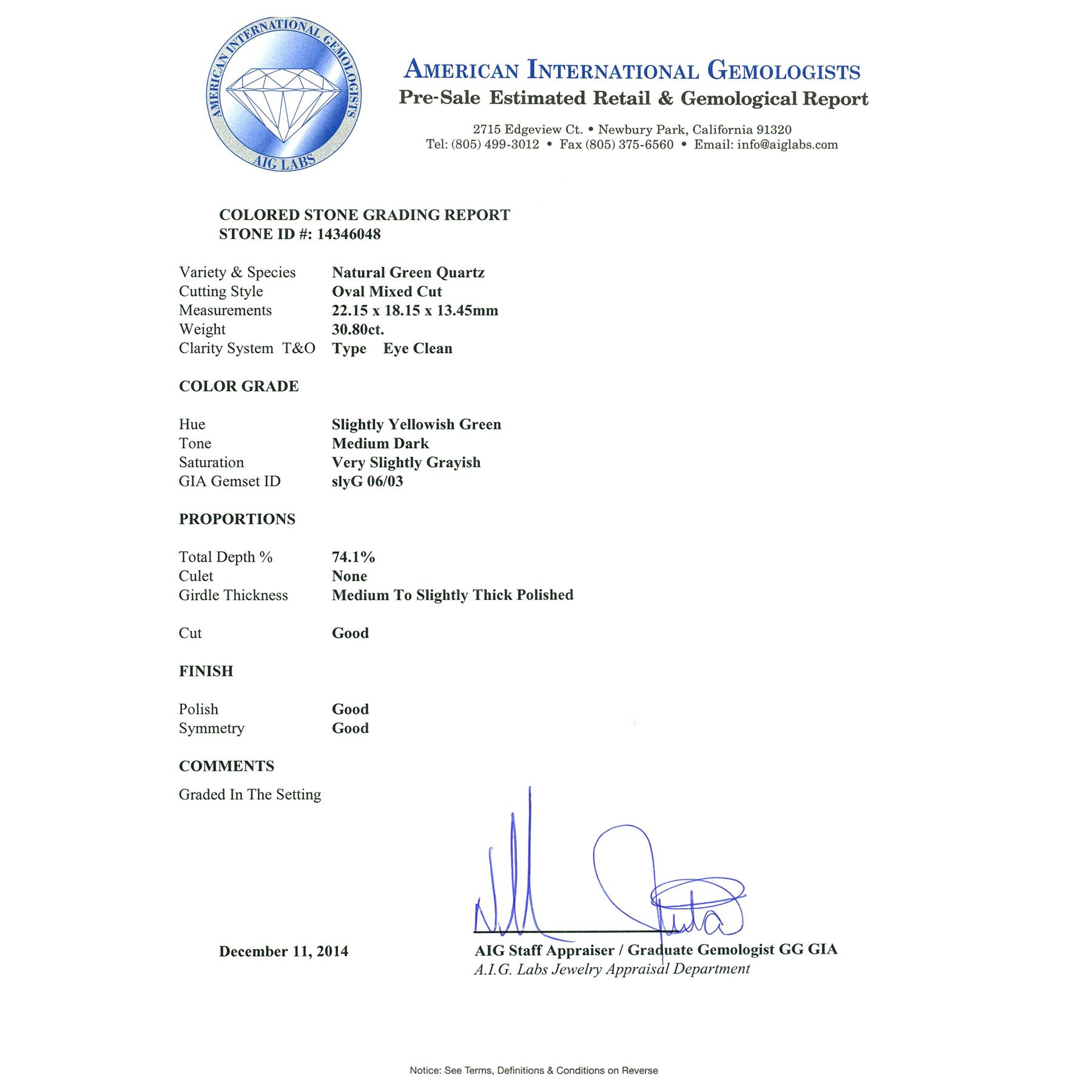 One electronically tested 14KT white gold ladies cast green quartz and diamond ring with a bright polish finish. The featured green quartz is set within a diamond bezel supported by an open heart lattice under gallery, completed by a two and one-half millimeter wide band. Identified with markings of "14K". Condition is new, good workmanship. Containing: One prong set oval mixed cut natural green quartz, measuring 22.15 x 18.15 x 13.45mm, 6% bulge factor, approximate weight of 30.80 ct., clarity is eye clean, medium dark, very slightly grayish, slightly yellowish green color, (GIA slyG 6/3), cut is good. Transmitting light with no distortion, transparent. Colored Stone Grading Report attached. Graded in the setting. Twenty-Eight prong set round brilliant cut diamonds, measuring 2.50 - 2.40 x 1.47mm (depth est.) approximate total weight of 28 Stones = 1.60 ct. Graded in the setting. Clarity: VS-2 to SI-2. Color: F - H. Total Weight of Colored Stones 30.80 ct. Total Weight of Diamonds 1.60 ct. Total Weight of Ring 15.16 grams. AIG Appraised.