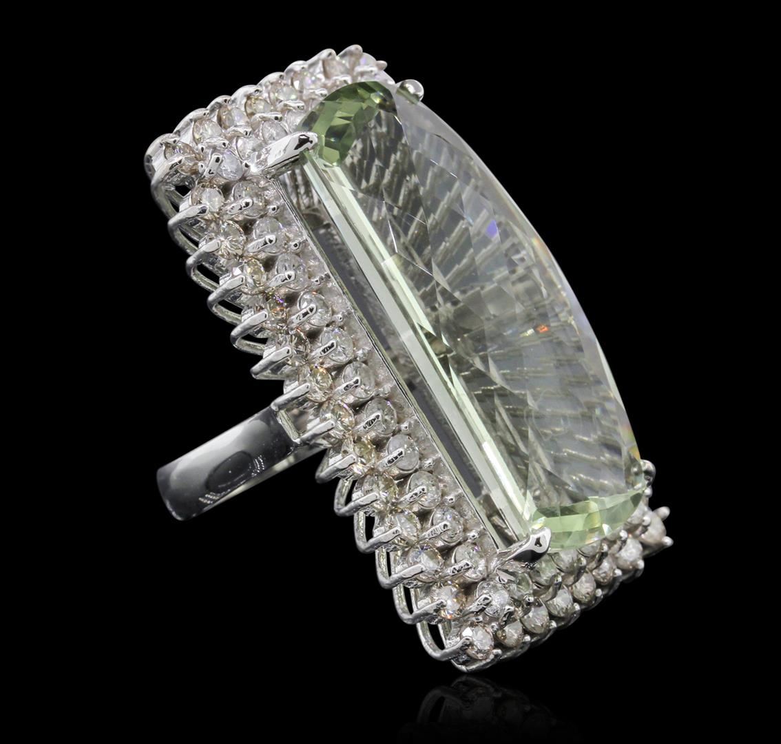 One electronically tested 14KT white gold ladies cast green quartz and diamond ring with a bright polish finish. Condition is new, good workmanship. The featured green quartz is set within two tiered diamond bezels, completed by a three and one-half millimeter wide band. Identified with markings of "K14". Containing: One prong set rectangular cushion mixed cut natural green quartz, measuring 33.50 x 14.50 x 9.45mm, 10%. bulge factor, approximate weight of 31.56ct., clarity is eye clean, medium, very slightly grayish, slightly yellowish green color, (GIA slyG 5/3), cut is good. Transmitting light with no distortion, transparent. Graded in the setting. Forty prong set round brilliant cut diamonds, measuring 2.80 - 2.70 x 1.65mm (depth est.) approximate. Total Weight of 40 Stones = 3.14ct. Color grade is an average for the group. Graded in the setting. Clarity: SI-1 to I-1 Thirty-Six prong set round brilliant cut diamonds, measuring 2.40 - 2.30 x 1.41mm (depth est.) approximate. Total Weight of 36 Stones = 1.81ct. Graded in the setting. Clarity: I-1 to I-2. Color: G - I. Total Weight of Colored Stones 31.56ct. Total Weight of Diamonds 4.95ct. Total Weight of Ring 24.80 grams. AIG Appraised at $14,645.00.