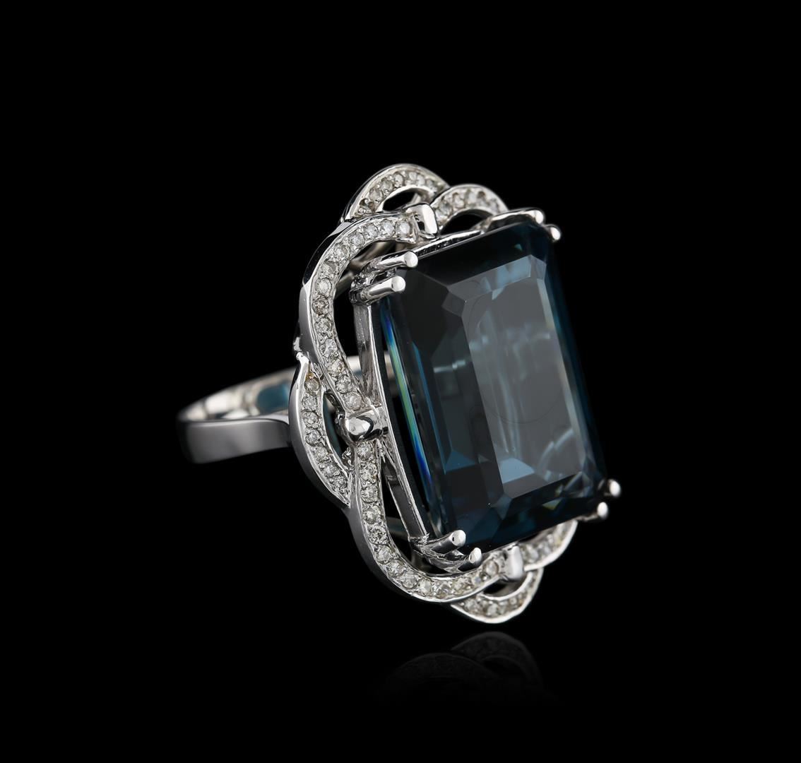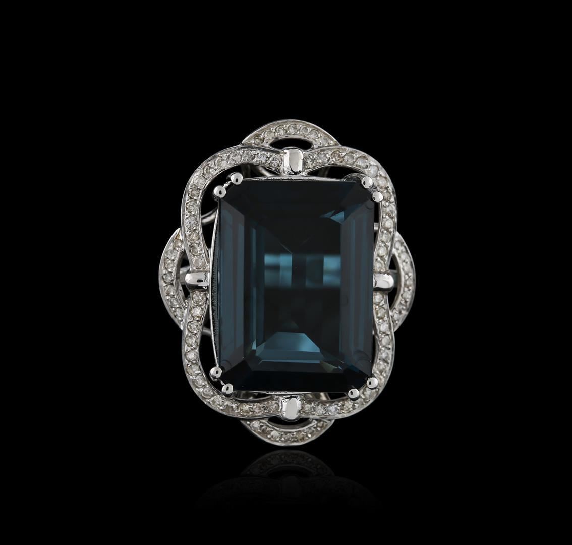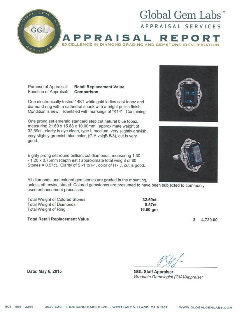 One electronically tested 14KT white gold ladies cast topaz and diamond ring with a cathedral shank with a bright polish finish. Identified with markings of "K14". Condition is new. Containing: One prong set emerald standard step cut natural blue topaz, measuring 21.60 x 15.88 x 10.00mm, approximate weight of 32.69ct., clarity is eye clean, type I, medium, very slightly grayish, very slightly greenish blue color, (GIA vslgB 5/3), cut is very good. Eighty prong set round brilliant cut diamonds, measuring 1.30 - 1.20 x 0.75mm (depth est.) approximate total weight of 80 Stones = 0.57ct. Clarity: SI-1 to I-1. Color: H - J, Cut is Good. All diamonds and colored gemstones are graded in the mounting, unless otherwise stated. Colored gemstones are presumed to have been subjected to commonly used enhancement processes.. Total Weight of Colored Stones 32.69ct. Total Weight of Diamonds 0.57ct. Total Weight of Ring 16.80 grams. GGL Appraised.