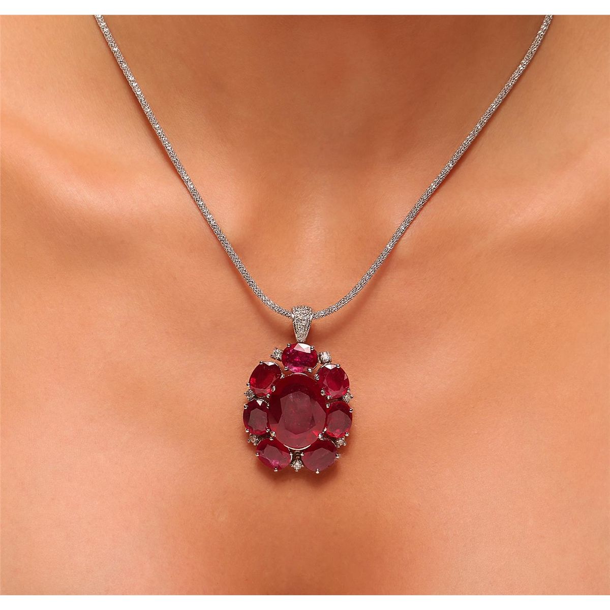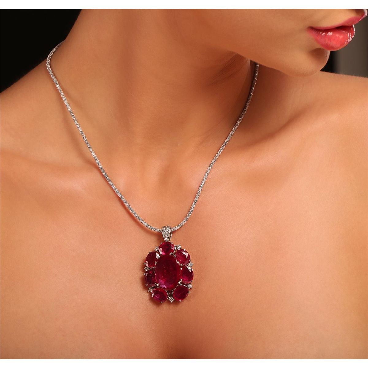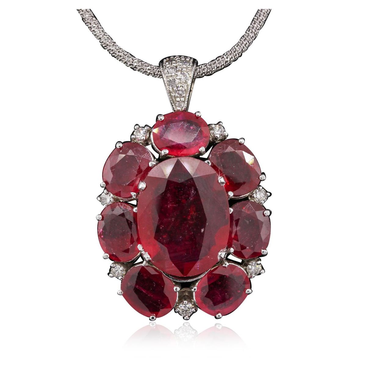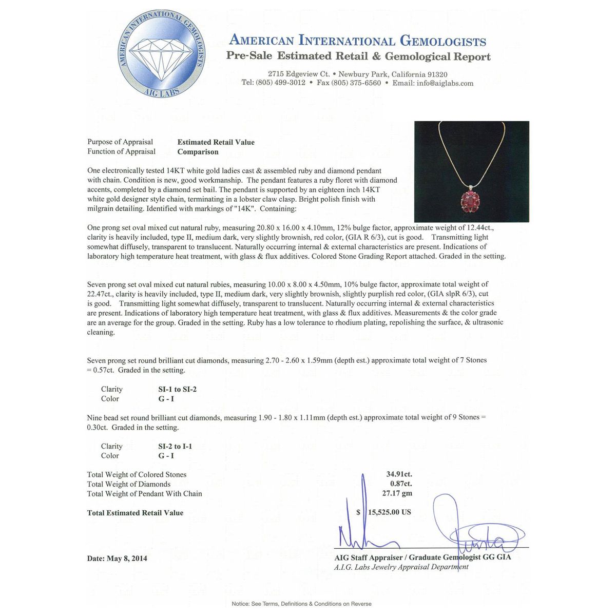 One electronically tested 14KT white gold ladies cast & assembled ruby and diamond pendant with chain. Condition is new, good workmanship. The pendant features a ruby floret with diamond accents, completed by a diamond set bail. The pendant is supported by an eighteen inch 14KT white gold designer style chain, terminating in a lobster claw clasp. Bright polish finish with milgrain detailing. Identified with markings of "14K". Containing: One prong set oval mixed cut natural ruby, measuring 20.80 x 16.00 x 4.10mm, 12%. bulge factor, approximate weight of 12.44ct., clarity is heavily included, type II, medium dark, very slightly brownish, red color, (GIA R 6/3), cut is good. Transmitting light somewhat diffusely, transparent to translucent. Naturally occurring internal & external characteristics are present. Indications of laboratory high temperature heat treatment, with glass & flux additives. Colored Stone Grading Report attached. Graded in the setting. Seven prong set oval mixed cut natural rubies, measuring 10.00 x 8.00 x 4.50mm, 10%. bulge factor, approximate. Total Weight of 22.47ct., clarity is heavily included, type II, medium dark, very slightly brownish, slightly purplish red color, (GIA slpR 6/3), cut is good. Transmitting light somewhat diffusely, transparent to translucent. Naturally occurring internal & external characteristics are present. Indications of laboratory high temperature heat treatment, with glass & flux additives. Measurements & the color grade are an average for the group. Graded in the setting. Ruby has a low tolerance to rhodium plating, repolishing the surface, & ultrasonic cleaning. Seven prong set round brilliant cut diamonds, measuring 2.70 - 2.60 x 1.59mm (depth est.) approximate. Total Weight of 7 Stones = 0.57ct. Graded in the setting. Clarity: SI-1 to SI-2. Color: G - I Nine bead set round brilliant cut diamonds, measuring 1.90 - 1.80 x 1.11mm (depth est.) approximate. Total Weight of 9 Stones = 0.30ct. Graded in the setting. Clarity: SI-2 to I-1. Color: G - I. Total Weight of Colored Stones 34.91ct. Total Weight of Diamonds 0.87ct. Total Weight of Pendant With Chain 27.17gm. AIG Appraised at $15,525.00.