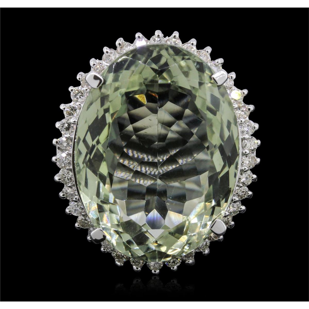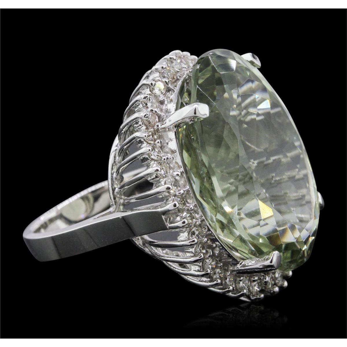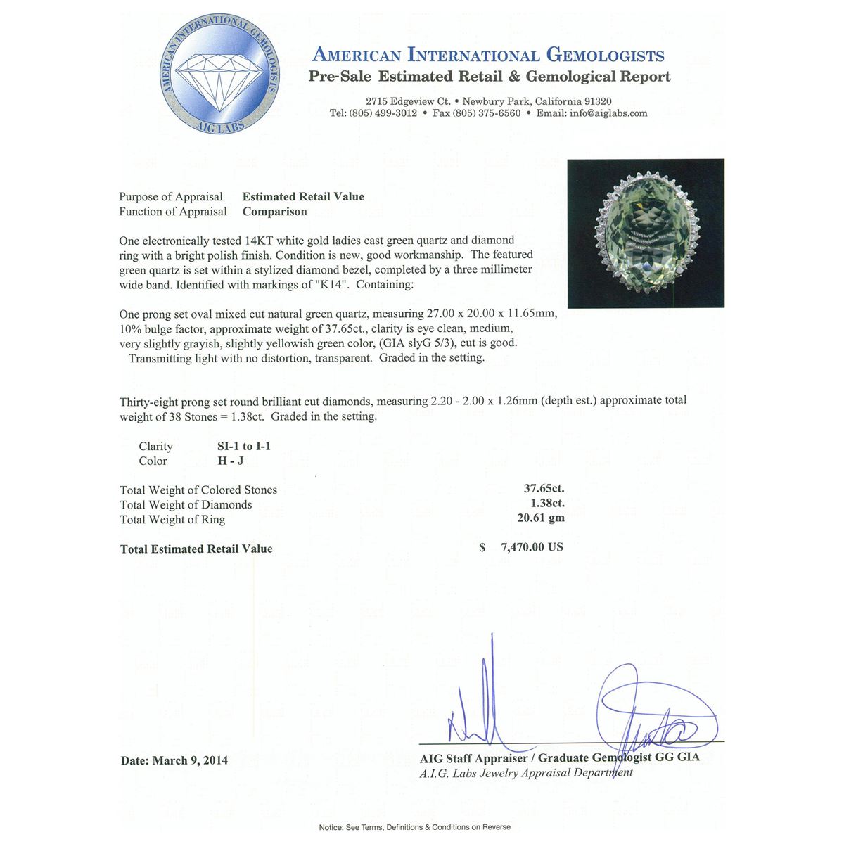 One electronically tested 14KT white gold ladies cast green quartz and diamond ring with a bright polish finish. Condition is new, good workmanship. The featured green quartz is set within a stylized diamond bezel, completed by a three millimeter wide band. Identified with markings of "K14". Containing: One prong set oval mixed cut natural green quartz, measuring 27.00 x 20.00 x 11.65mm, 10%. bulge factor, approximate weight of 37.65ct., clarity is eye clean, medium, very slightly grayish, slightly yellowish green color, (GIA slyG 5/3), cut is good. Transmitting light with no distortion, transparent. Graded in the setting. Thirty-Eight prong set round brilliant cut diamonds, measuring 2.20 - 2.00 x 1.26mm (depth est.) approximate. Total Weight of 38 Stones = 1.38ct. Graded in the setting. Clarity: SI-1 to I-1. Color: H - J. Total Weight of Colored Stones 37.65ct. Total Weight of Diamonds 1.38ct. Total Weight of Ring 20.61 grams. AIG Appraised at $7,470.00.
