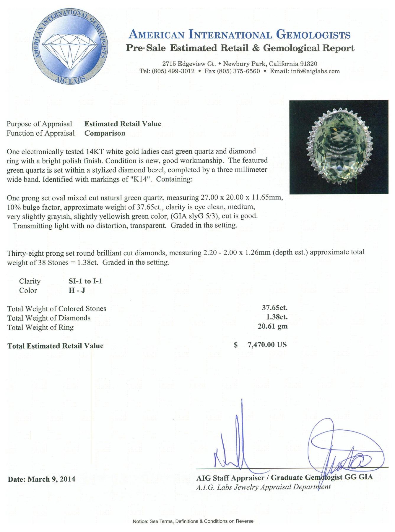 One electronically tested 14KT white gold ladies cast green quartz and diamond ring with a bright polish finish. Condition is new, good workmanship. The featured green quartz is set within a stylized diamond bezel, completed by a three millimeter wide band. Identified with markings of "K14". Containing: One prong set oval mixed cut natural green quartz, measuring 27.00 x 20.00 x 11.65mm, 10%. bulge factor, approximate weight of 37.65ct., clarity is eye clean, medium, very slightly grayish, slightly yellowish green color, (GIA slyG 5/3), cut is good. Transmitting light with no distortion, transparent. Graded in the setting. Thirty-Eight prong set round brilliant cut diamonds, measuring 2.20 - 2.00 x 1.26mm (depth est.) approximate. Total Weight of 38 Stones = 1.38ct. Graded in the setting. Clarity: SI-1 to I-1. Color: H - J. Total Weight of Colored Stones 37.65ct. Total Weight of Diamonds 1.38ct. Total Weight of Ring 20.61 grams. AIG Appraised.