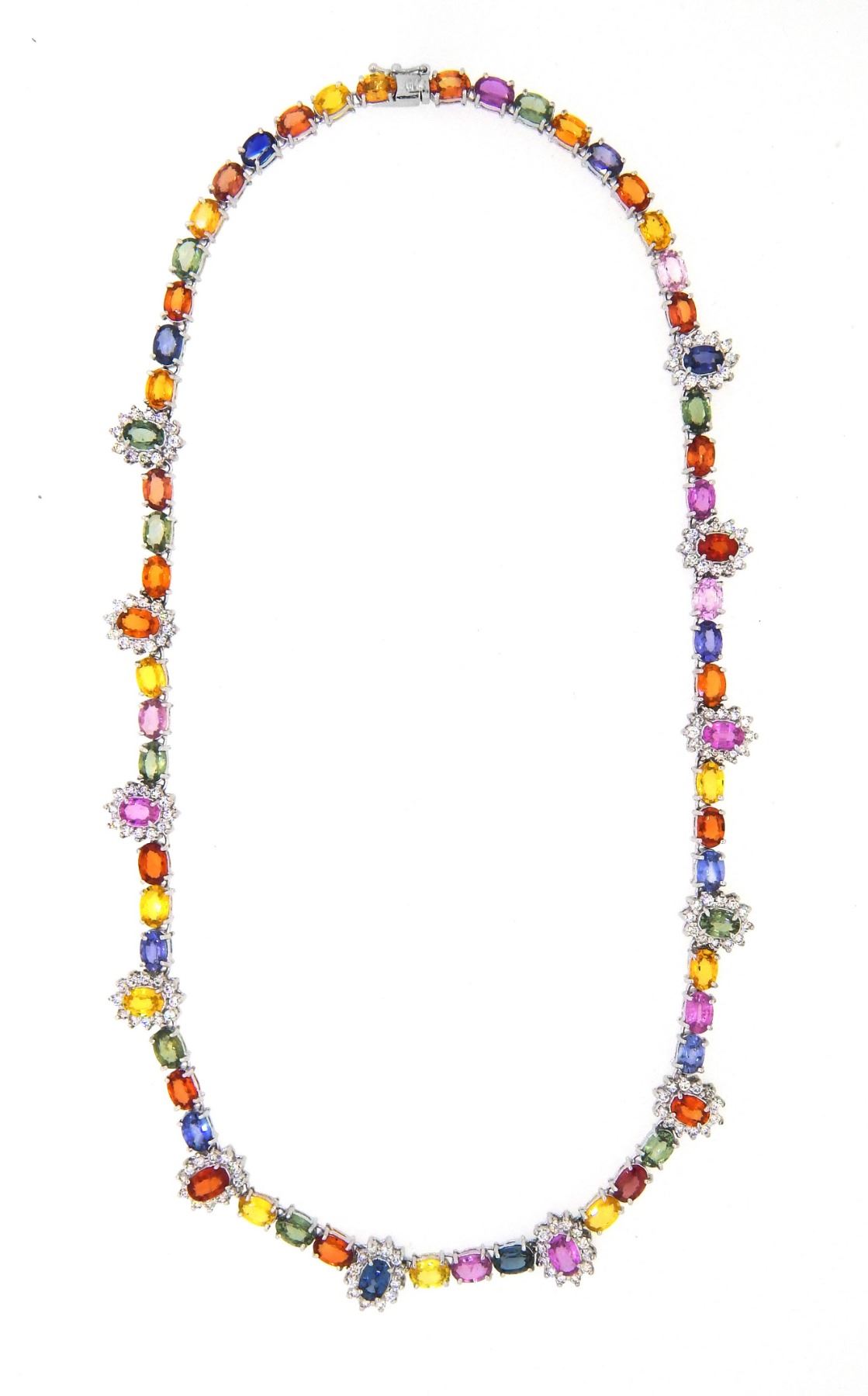 One 14KT White Gold 37.90ctw Multi Color Sapphire and Diamond Necklace. (46) Multi color Sapphires with a total weight of 37.90cts. (144) Diamonds with a total weight of 2.80cts with a color of F-G and clarity of VS-2 to SI-1. Total weight of this necklace is 33.9 grams.
