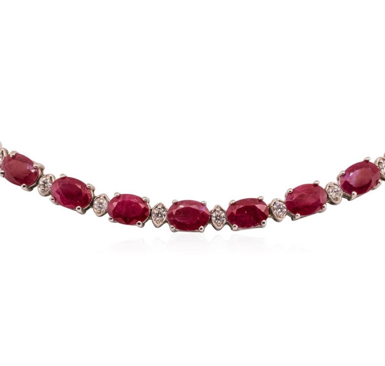 One 14KT solid white gold ladies necklace bright polish finish identified with "14K" marking. Condition is good. Measurements 5x444mm. Size: 17.5. Total Item Weight: 24.5 grams. Containing: 46 prong set oval cut red rubys. 37 ctw. Measurements 5 x 7mm, Hue: Red-Purple. Saturation: Moderately Strong. Tone: Dark. Clarity: Type 2. Cut: Very Good. 46 prong set round cut white diamonds. Measurements: 1.9mm. Color Grade: H - I. Clarity: SI1 - SI2. Cut: Very good BHGL Appraised.