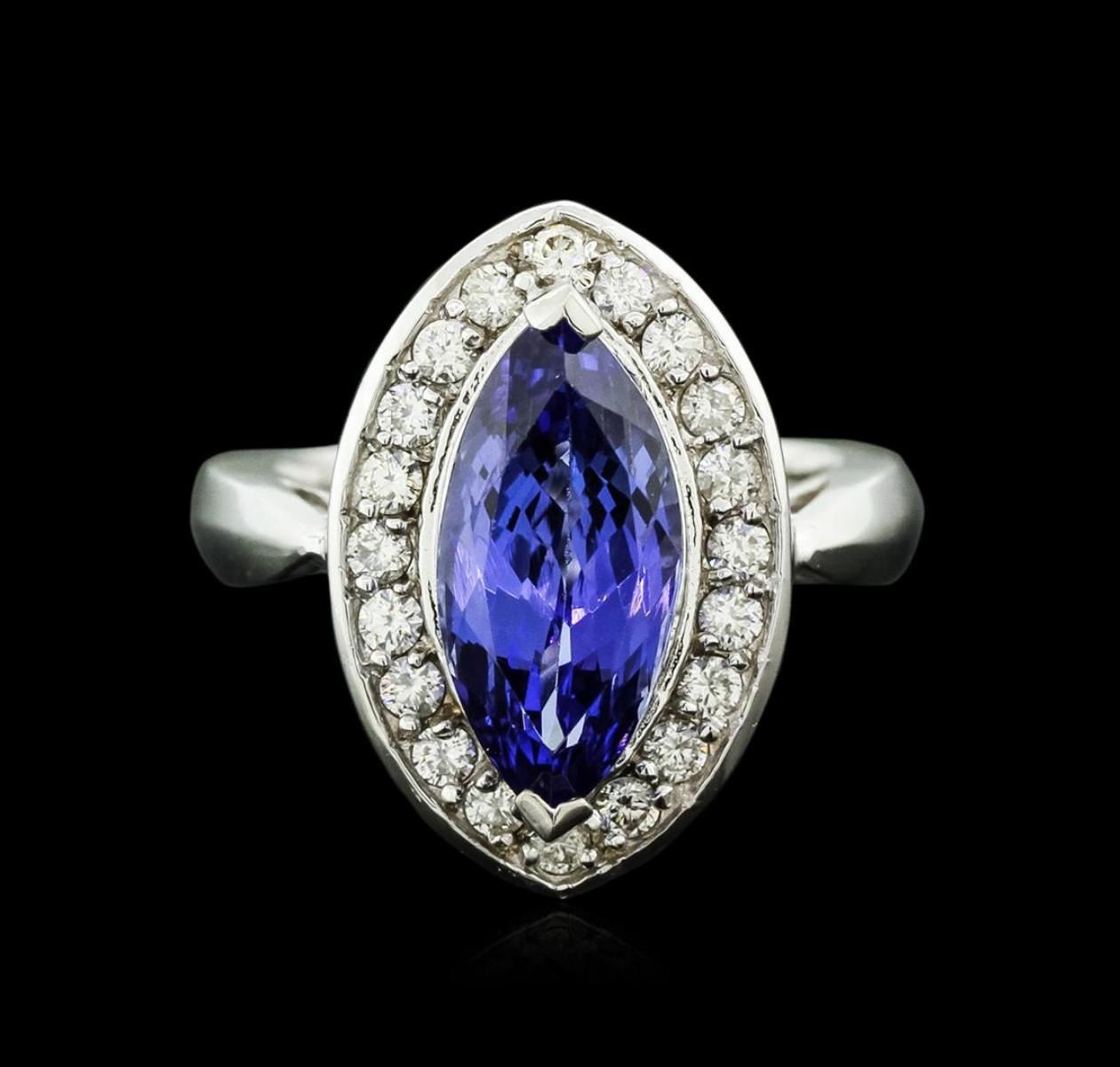 One electronically tested 14KT white gold ladies cast tanzanite and diamond ring with a bright polish finish. Identified with markings of "14K". Condition is new. Containing: One prong set marquise modified brilliant cut natural tanzanite, measuring 14.50 x 7.00 x 6.20mm, approximate weight of 4.01ct., clarity is eye clean, type I, medium light, very slightly grayish, violet color, (GIA V 4/3), cut is good. Twenty prong set round brilliant cut diamonds, measuring 1.70 - 1.70 x 1.02mm (depth est.) approximate total weight of 20 Stones = 0.36ct.. Clarity: SI-1 to SI-2. Color: I - J, Cut is Good. Colored gemstones are presumed to have been subjected to commonly used enhancement processes. All diamonds and colored gemstones are graded in the mounting, unless otherwise stated.. Total Weight of Colored Stones 4.01ct.. Total Weight of Diamonds 0.36ct.. Total Weight of Ring 9.20 grams. GGL Appraised.