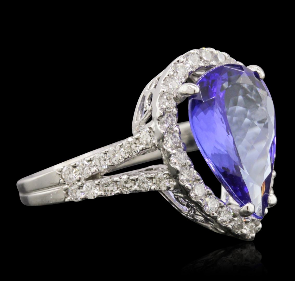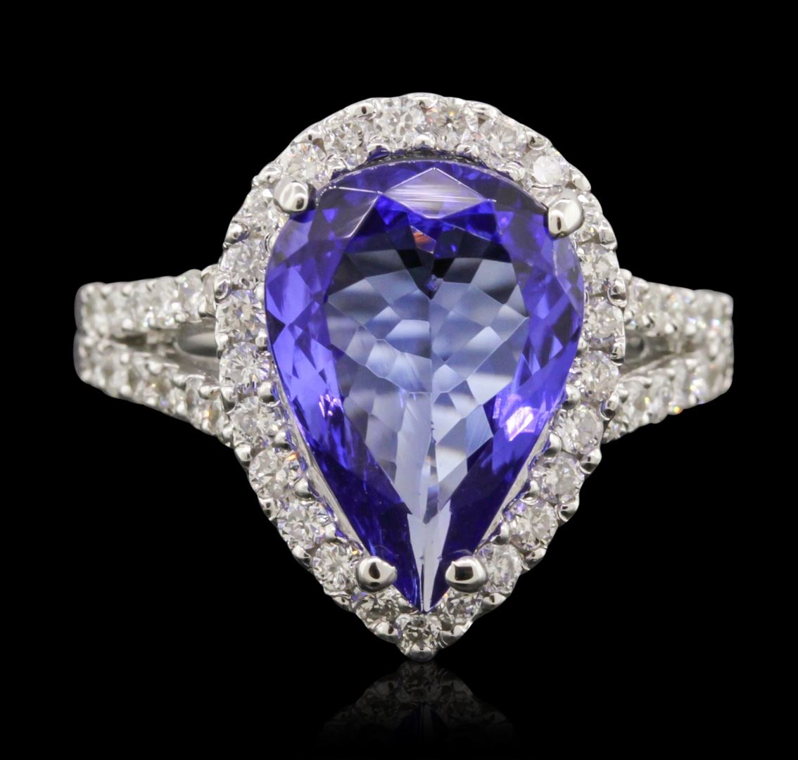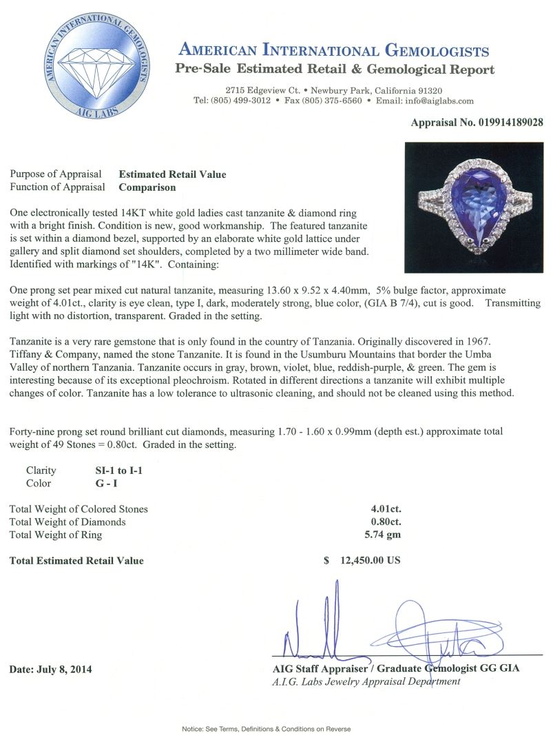 One electronically tested 14KT white gold ladies cast tanzanite & diamond ring with a bright finish. The featured tanzanite is set within a diamond bezel, supported by an elaborate white gold lattice under gallery and split diamond set shoulders, completed by a two millimeter wide band. Identified with markings of "14K". Condition is new, good workmanship. Containing: One prong set pear mixed cut natural tanzanite, measuring 13.60 x 9.52 x 4.40mm, 5%. bulge factor, approximate weight of 4.01ct., clarity is eye clean, type I, dark, moderately strong, blue color, (GIA B 7/4), cut is good. Transmitting light with no distortion, transparent. Graded in the setting. Tanzanite is a very rare gemstone that is only found in the country of Tanzania. Originally discovered in 1967. Tiffany & Company, named the stone Tanzanite. It is found in the Usumburu Mountains that border the Umba Valley of northern Tanzania. Tanzanite occurs in gray, brown, violet, blue, reddish-purple, & green. The gem is interesting because of its exceptional pleochroism. Rotated in different directions a tanzanite will exhibit multiple changes of color. Tanzanite has a low tolerance to ultrasonic cleaning, and should not be cleaned using this method. Forty-Nine prong set round brilliant cut diamonds, measuring 1.70 - 1.60 x 0.99mm (depth est.) approximate total weight of 49 Stones = 0.80ct. Graded in the setting. Clarity: SI-1 to I-1 . Color: G - I. Total Weight of Colored Stones 4.01ct. Total Weight of Diamonds 0.80ct. Total Weight of Ring 5.74 grams. AIG Appraised at $12,450.00.
