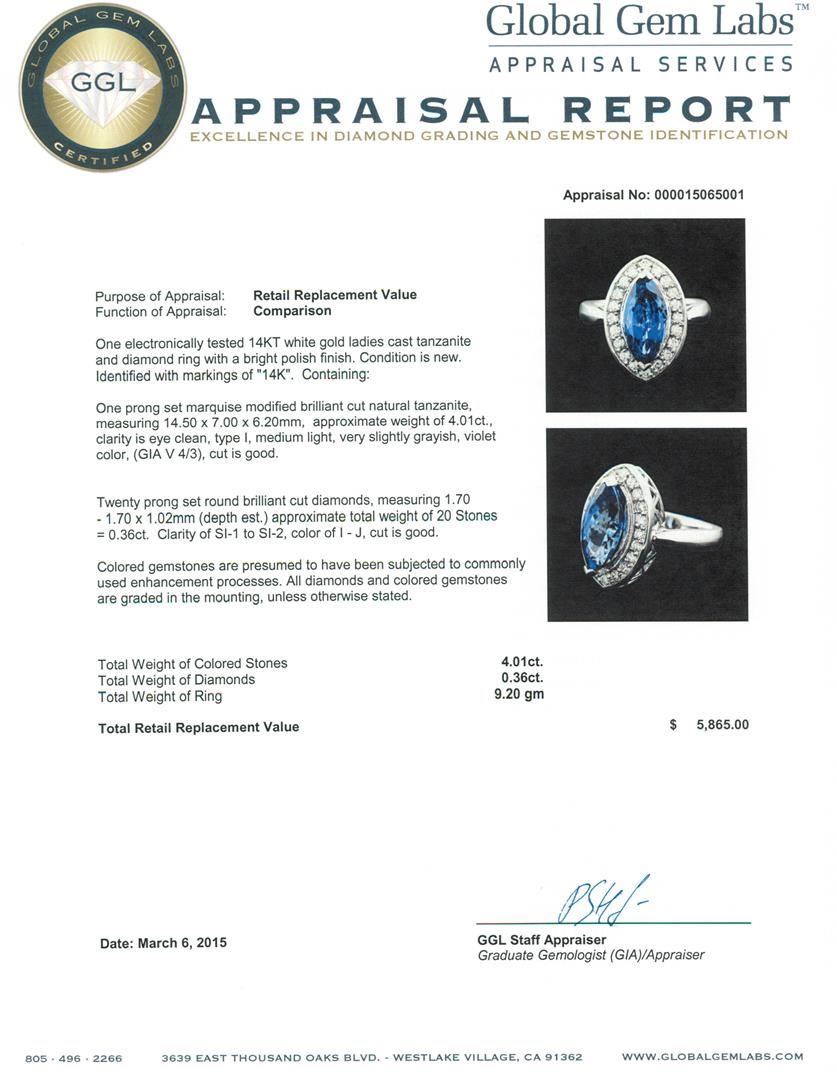 One electronically tested 14KT white gold ladies cast tanzanite and diamond ring with a bright polish finish. Identified with markings of "14K". Condition is new. Containing: One prong set marquise modified brilliant cut natural tanzanite, measuring 14.50 x 7.00 x 6.20mm, approximate weight of 4.01ct., clarity is eye clean, type I, medium light, very slightly grayish, violet color, (GIA V 4/3), cut is good. Twenty prong set round brilliant cut diamonds, measuring 1.70 - 1.70 x 1.02mm (depth est.) approximate total weight of 20 Stones = 0.36ct.. Clarity: SI-1 to SI-2. Color: I - J, Cut is Good. Colored gemstones are presumed to have been subjected to commonly used enhancement processes. All diamonds and colored gemstones are graded in the mounting, unless otherwise stated.. Total Weight of Colored Stones 4.01ct.. Total Weight of Diamonds 0.36ct.. Total Weight of Ring 9.20 grams. GGL Appraised at $5,865.00.