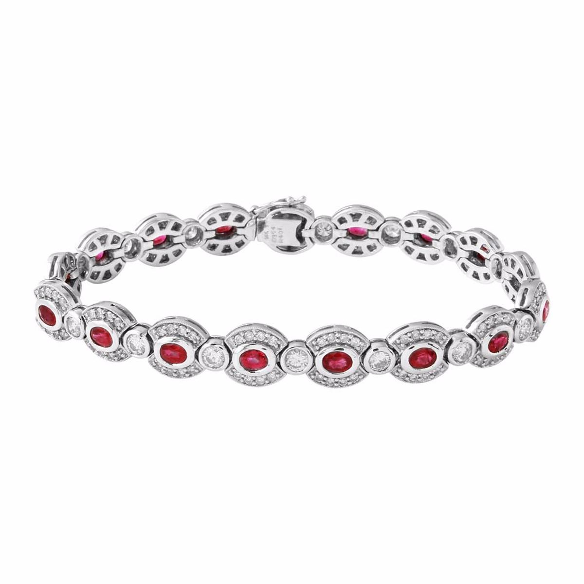 One 14KT White Gold 4.01ctw Ruby and Diamond Bracelet. (17) Ruby with a total weight of 4.01cts. (153) Diamonds with a total weight of 3.64cts. Length is 7.5 inches. The total weight of this bracelet is 24.94 grams.