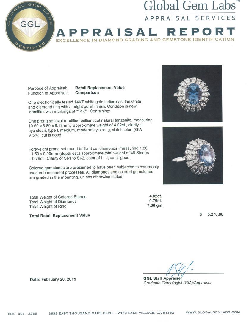 One electronically tested 14KT white gold ladies cast tanzanite and diamond ring with a bright polish finish. Identified with markings of "14K". Condition is new. Containing: One prong set oval modified brilliant cut natural tanzanite, measuring 10.60 x 8.80 x 6.13mm, approximate weight of 4.02ct., clarity is eye clean, type I, medium, moderately strong, violet color, (GIA V 5/4), cut is good. Forty-Eight prong set round brilliant cut diamonds, measuring 1.80 - 1.50 x 0.99mm (depth est.) approximate total weight of 48 Stones = 0.79ct. Clarity: SI-1 to SI-2. Color: I - J, Cut is Good. Colored gemstones are presumed to have been subjected to commonly used enhancement processes. All diamonds and colored gemstones are graded in the mounting, unless otherwise stated. Total Weight of Colored Stones 4.02ct. Total Weight of Diamonds 0.79ct. Total Weight of Ring 7.60 grams. GGL Appraised at $5,270.00.