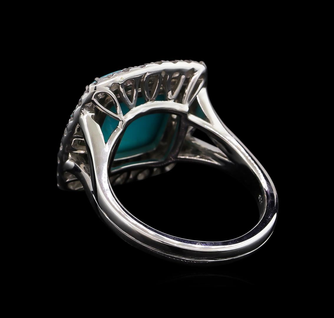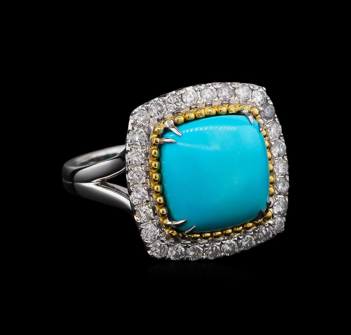 One electronically tested 14KT white gold ladies cast turquoise and diamond ring. Condition is new, good workmanship. The featured turquoise is set within an inner rope bezel and an outer diamond bezel supported by split shoulders, completed by a grooved two and one-half millimeter wide band. Bright polish finish with yellow gold accents. Identified with markings of "14K 585". Containing: One prong set square cushion cabochon cut natural turquoise, measuring 11.00 x 11.00 x 4.35mm, approximate weight of 4.02ct., clarity is severely included, medium, very slightly grayish, very slightly greenish blue color, (GIA vslgB 5/3), cut is good. Transmitting light very diffusely, opaque. Naturally occurring internal & external characteristics are present. Graded in the setting. Turquoise is commonly impregnated to improve the color and texture. Evidence that may confirm this is typically lacking. Twenty-Eight prong set round brilliant cut diamonds, measuring 1.80 - 1.70 x 1.05mm (depth est.) approximate. Total Weight of 28 Stones = 0.65ct. Graded in the setting. Clarity: SI-1 to I-1. Color: G - I. Total Weight of Colored Stones 4.02ct. Total Weight of Diamonds 0.65ct. Total Weight of Ring 7.05 grams. AIG Appraised at $3,605.00.