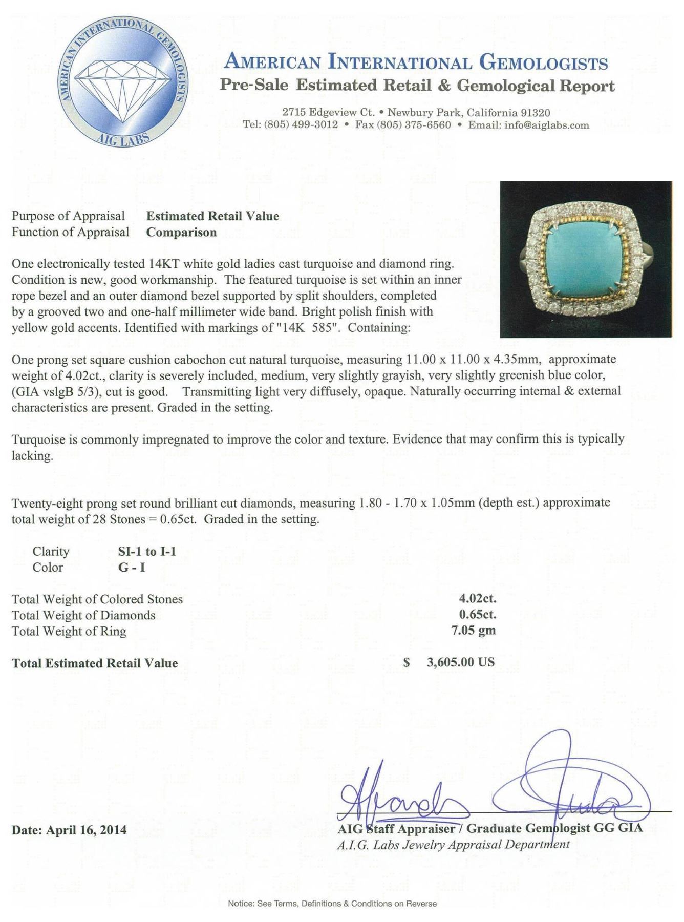 One electronically tested 14KT white gold ladies cast turquoise and diamond ring. Condition is new, good workmanship. The featured turquoise is set within an inner rope bezel and an outer diamond bezel supported by split shoulders, completed by a grooved two and one-half millimeter wide band. Bright polish finish with yellow gold accents. Identified with markings of "14K 585". Containing: One prong set square cushion cabochon cut natural turquoise, measuring 11.00 x 11.00 x 4.35mm, approximate weight of 4.02ct., clarity is severely included, medium, very slightly grayish, very slightly greenish blue color, (GIA vslgB 5/3), cut is good. Transmitting light very diffusely, opaque. Naturally occurring internal & external characteristics are present. Graded in the setting. Turquoise is commonly impregnated to improve the color and texture. Evidence that may confirm this is typically lacking. Twenty-Eight prong set round brilliant cut diamonds, measuring 1.80 - 1.70 x 1.05mm (depth est.) approximate. Total Weight of 28 Stones = 0.65ct. Graded in the setting. Clarity: SI-1 to I-1. Color: G - I. Total Weight of Colored Stones 4.02ct. Total Weight of Diamonds 0.65ct. Total Weight of Ring 7.05 grams. AIG Appraised.