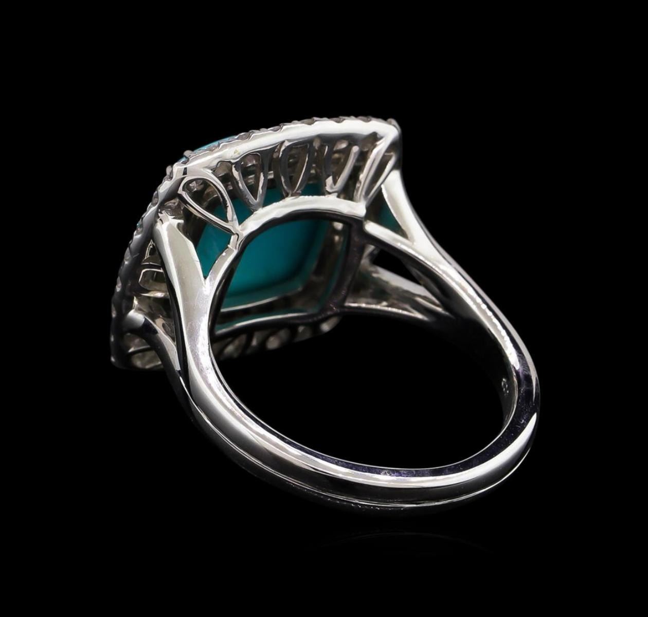 One electronically tested 14KT white gold ladies cast turquoise and diamond ring. Condition is new, good workmanship. The featured turquoise is set within an inner rope bezel and an outer diamond bezel supported by split shoulders, completed by a grooved two and one-half millimeter wide band. Bright polish finish with yellow gold accents. Identified with markings of "14K 585". Containing: One prong set square cushion cabochon cut natural turquoise, measuring 11.00 x 11.00 x 4.35mm, approximate weight of 4.02ct., clarity is severely included, medium, very slightly grayish, very slightly greenish blue color, (GIA vslgB 5/3), cut is good. Transmitting light very diffusely, opaque. Naturally occurring internal & external characteristics are present. Graded in the setting. Turquoise is commonly impregnated to improve the color and texture. Evidence that may confirm this is typically lacking. Twenty-Eight prong set round brilliant cut diamonds, measuring 1.80 - 1.70 x 1.05mm (depth est.) approximate. Total Weight of 28 Stones = 0.65ct. Graded in the setting. Clarity: SI-1 to I-1. Color: G - I. Total Weight of Colored Stones 4.02ct. Total Weight of Diamonds 0.65ct. Total Weight of Ring 7.05 grams. AIG Appraised.
