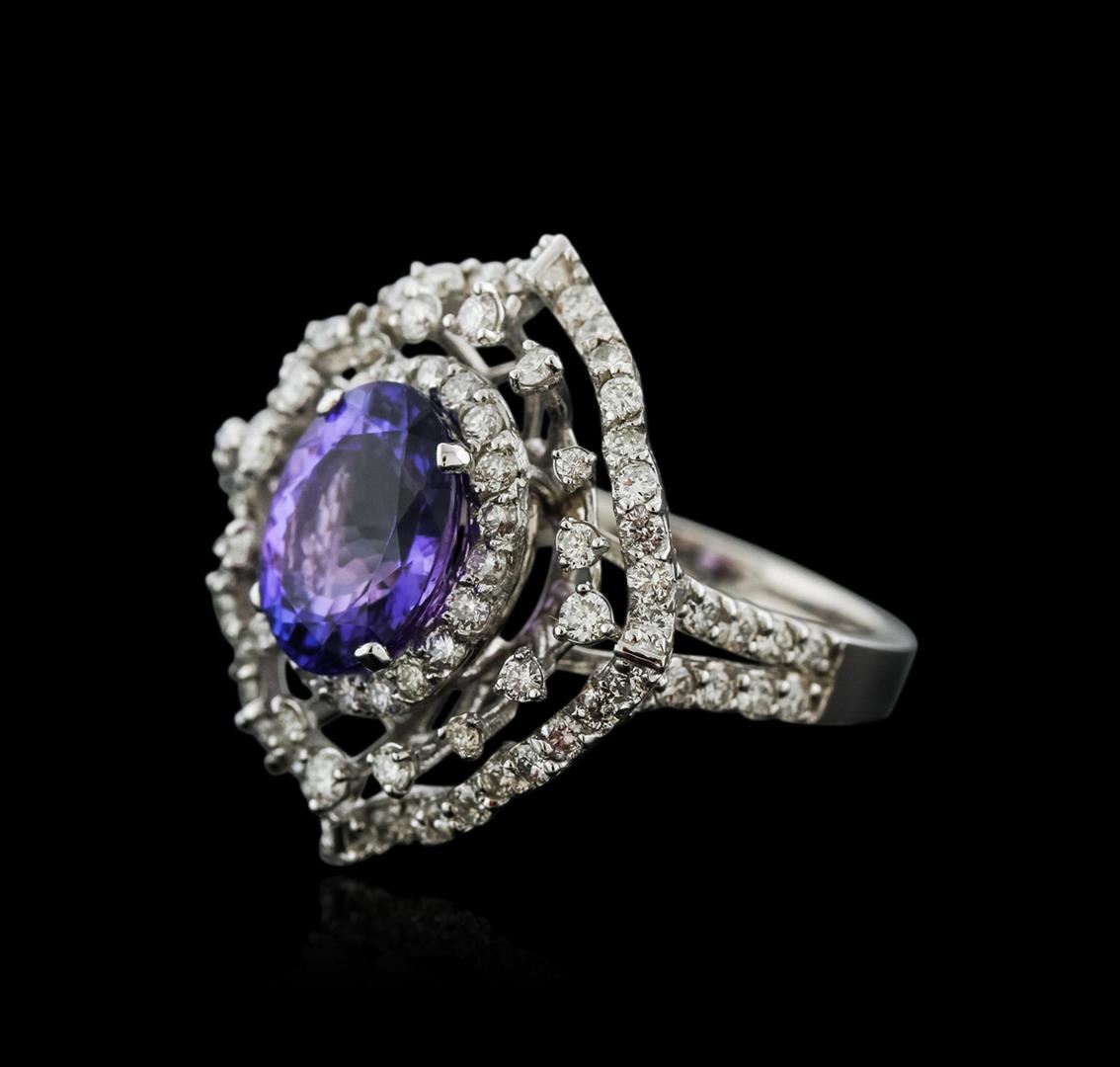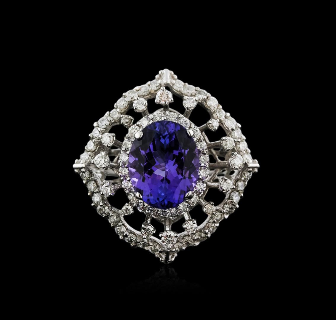 One electronically tested 14KT white gold ladies cast tanzanite and diamond ring with a bright polish finish. Identified with markings of "K14". Condition is new. Containing: One prong set oval modified brilliant cut natural tanzanite, measuring 10.50 x 8.30 x 6.59mm, approximate weight of 4.04ct., clarity is eye clean, type I, medium light, very slightly grayish, violet color, (GIA V 4/3), cut is good. Ninety-Two prong set round brilliant cut diamonds, measuring 1.60 - 1.20 x 0.84mm (depth est.) approximate total weight of 92 Stones = 0.50ct. Clarity: SI-1 to I-1. Color: G - H, Cut is Good. Colored gemstones are presumed to have been subjected to commonly used enhancement processes. All diamonds and colored gemstones are graded in the mounting, unless otherwise stated. Total Weight of Colored Stones 4.04ct. Total Weight of Diamonds 0.50ct. Total Weight of Ring 6.60 grams. GGL Appraised at $5,080.00.