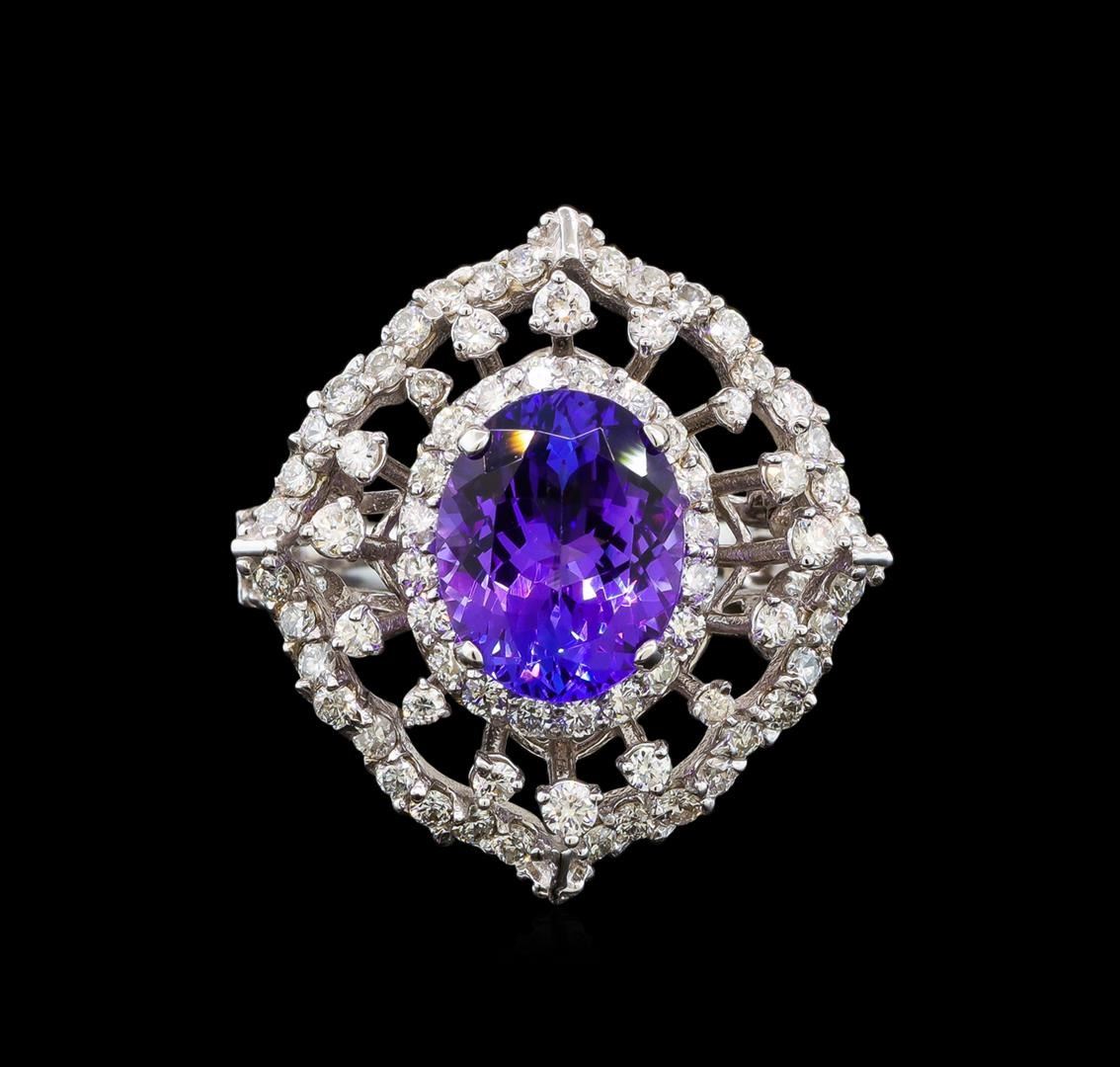One electronically tested 14KT white gold ladies cast tanzanite and diamond ring with a bright polish finish. Identified with markings of "K14". Condition is new. Containing: One prong set oval modified brilliant cut natural tanzanite, measuring 10.50 x 8.30 x 6.59mm, approximate weight of 4.04ct., clarity is eye clean, type I, medium light, very slightly grayish, violet color, (GIA V 4/3), cut is good. Ninety-Two prong set round brilliant cut diamonds, measuring 1.60 - 1.20 x 0.84mm (depth est.) approximate total weight of 92 Stones = 0.50 ct. Clarity: SI-1 to I-1. Color: G - H, Cut is Good. Colored gemstones are presumed to have been subjected to commonly used enhancement processes. All diamonds and colored gemstones are graded in the mounting, unless otherwise stated. Total Weight of Colored Stones 4.04ct. Total Weight of Diamonds 0.50 ct. Total Weight of Ring 6.60 grams. GGL Appraised.