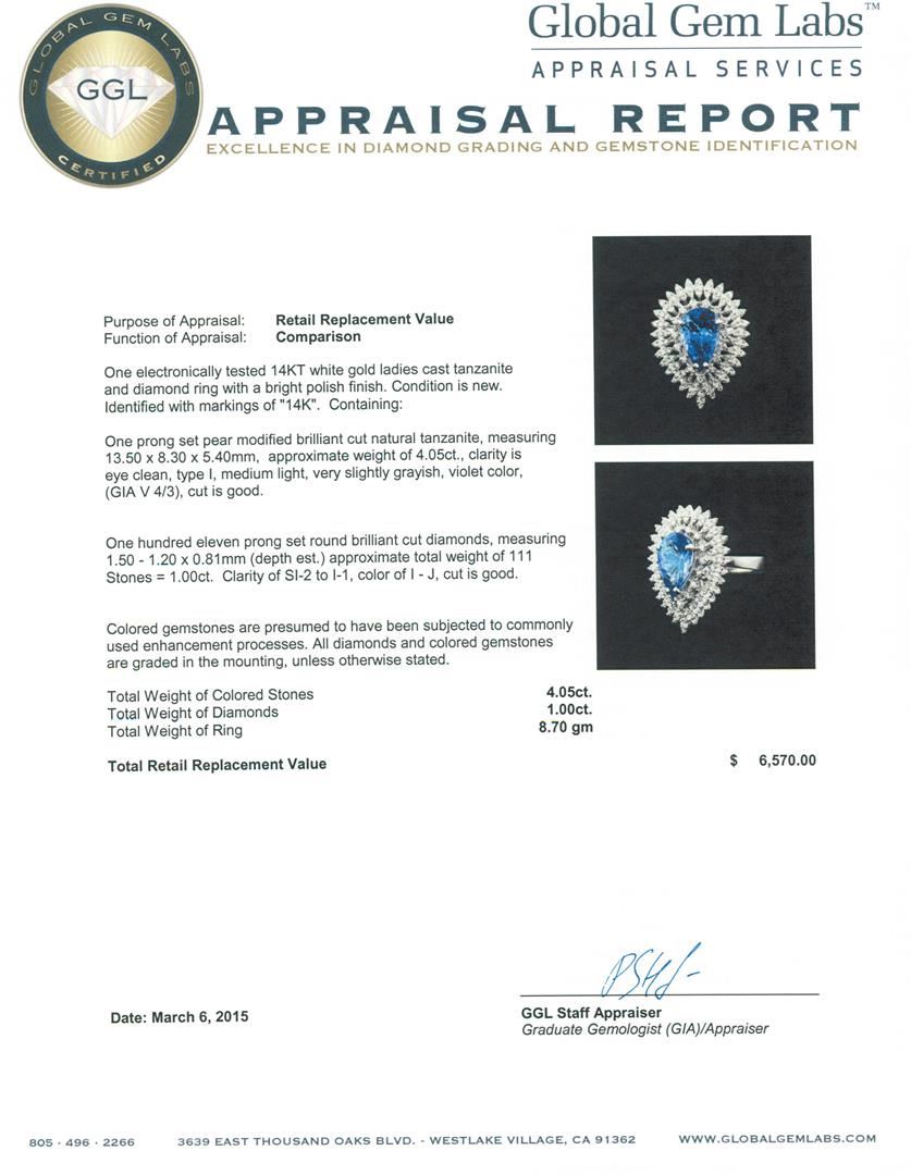 One electronically tested 14KT white gold ladies cast tanzanite and diamond ring with a bright polish finish. Identified with markings of "14K". Condition is new. Containing: One prong set pear modified brilliant cut natural tanzanite, measuring 13.50 x 8.30 x 5.40mm, approximate weight of 4.05ct., clarity is eye clean, type I, medium light, very slightly grayish, violet color, (GIA V 4/3), cut is good. One Hundred Eleven prong set round brilliant cut diamonds, measuring 1.50 - 1.20 x 0.81mm (depth est.) approximate total weight of 111 Stones = 1.00ct.. Clarity: SI-2 to I-1. Color: I - J, Cut is Good. Colored gemstones are presumed to have been subjected to commonly used enhancement processes. All diamonds and colored gemstones are graded in the mounting, unless otherwise stated.. Total Weight of Colored Stones 4.05ct.. Total Weight of Diamonds 1.00ct.. Total Weight of Ring 8.70 grams. GGL Appraised at $6,570.00.