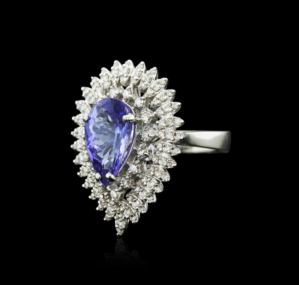 One electronically tested 14KT white gold ladies cast tanzanite and diamond ring with a bright polish finish. Identified with markings of "14K". Condition is new. Containing: One prong set pear modified brilliant cut natural tanzanite, measuring 13.50 x 8.30 x 5.40mm, approximate weight of 4.05ct., clarity is eye clean, type I, medium light, very slightly grayish, violet color, (GIA V 4/3), cut is good. One Hundred Eleven prong set round brilliant cut diamonds, measuring 1.50 - 1.20 x 0.81mm (depth est.) approximate total weight of 111 Stones = 1.00 ct.. Clarity: SI-2 to I-1. Color: I - J, Cut is Good. Colored gemstones are presumed to have been subjected to commonly used enhancement processes. All diamonds and colored gemstones are graded in the mounting, unless otherwise stated.. Total Weight of Colored Stones 4.05ct.. Total Weight of Diamonds 1.00 ct.. Total Weight of Ring 8.70 grams. GGL Appraised.