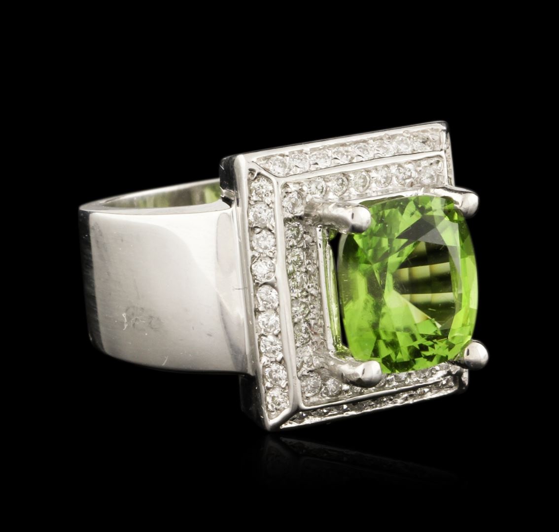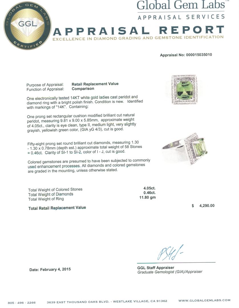 One electronically tested 14KT white gold ladies cast peridot and diamond ring with a bright polish finish. Identified with markings of "14K". Condition is new. Containing: One prong set rectangular cushion modified brilliant cut natural peridot, measuring 9.81 x 9.00 x 5.85mm, approximate weight of 4.05ct., clarity is eye clean, type II, medium light, very slightly grayish, yellowish green color, (GIA yG 4/3), cut is good. Fifty-Eight prong set round brilliant cut diamonds, measuring 1.30 - 1.30 x 0.78mm (depth est.) approximate total weight of 58 Stones = 0.46ct. Clarity: SI-1 to SI-2. Color: I - J, Cut is Good. Colored gemstones are presumed to have been subjected to commonly used enhancement processes. All diamonds and colored gemstones are graded in the mounting, unless otherwise stated. Total Weight of Colored Stones 4.05ct. Total Weight of Diamonds 0.46ct. Total Weight of Ring 11.80 grams. GGL Appraised at $4,290.00.