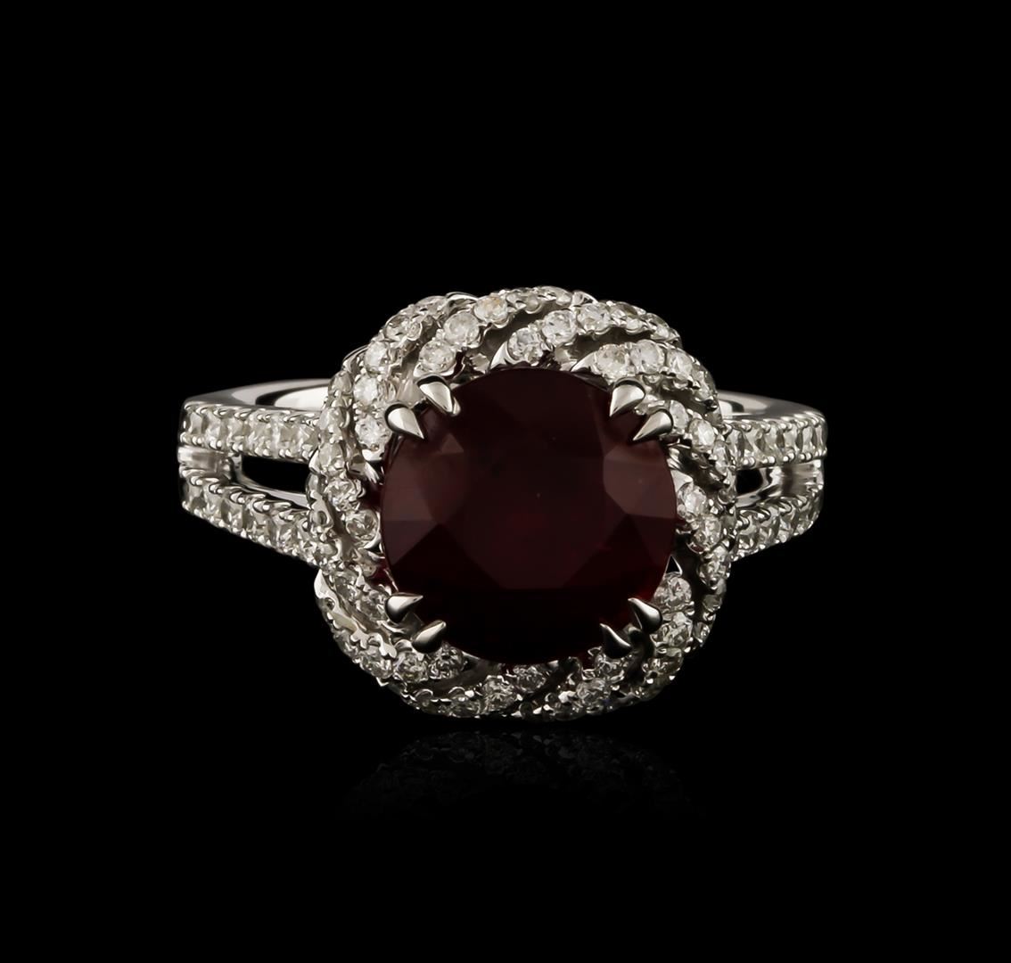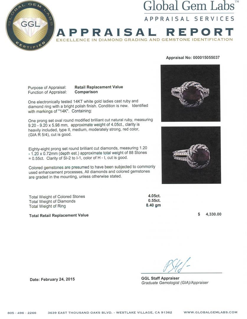 One electronically tested 14KT white gold ladies cast ruby and diamond ring with a bright polish finish. Identified with markings of "14K". Condition is new. Containing: One prong set oval round modified brilliant cut natural ruby, measuring 9.20 - 9.20 x 5.98 mm, approximate weight of 4.05ct., clarity is heavily included, type II, medium, moderately strong, red color, (GIA R 5/4), cut is good. Eighty-Eight prong set round brilliant cut diamonds, measuring 1.20 - 1.20 x 0.72mm (depth est.) approximate total weight of 88 Stones = 0.55ct. Clarity: SI-2 to I-1. Color: H - I, Cut is Good. Colored gemstones are presumed to have been subjected to commonly used enhancement processes, All diamonds and colored gemstones are graded in the mounting, unless otherwise stated. Total Weight of Colored Stones 4.05ct. Total Weight of Diamonds 0.55ct. Total Weight of Ring 8.40 grams. GGL Appraised at $4,330.00.